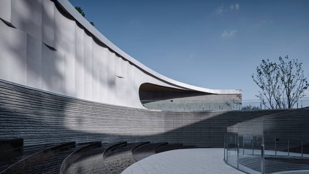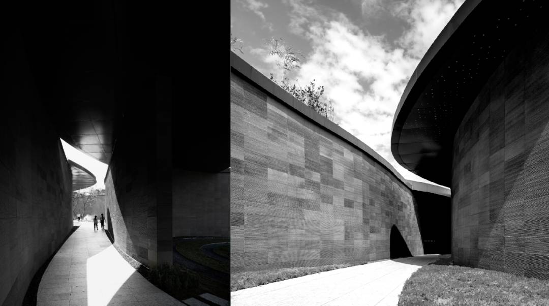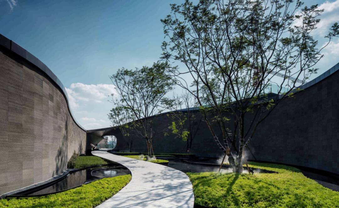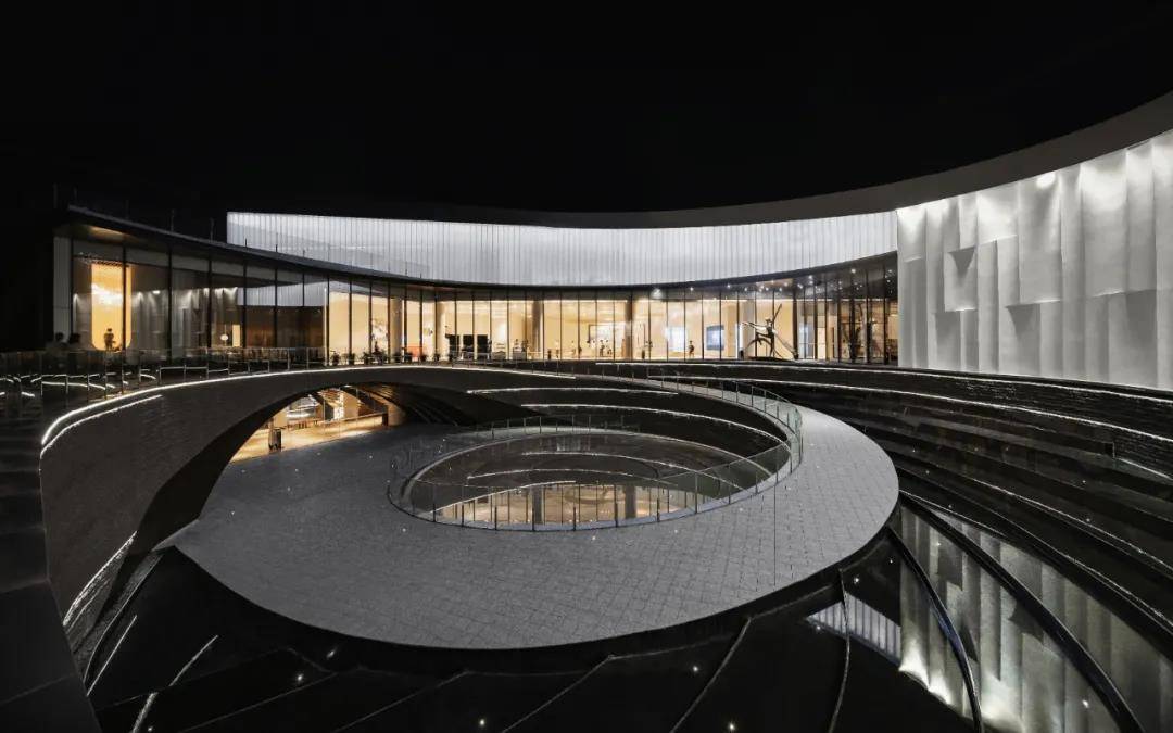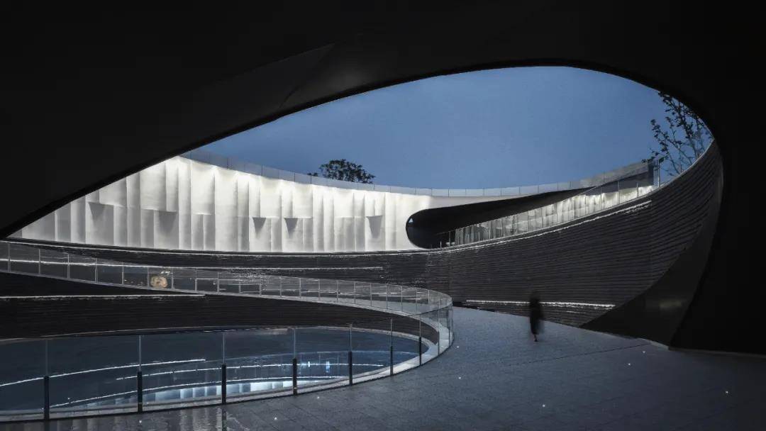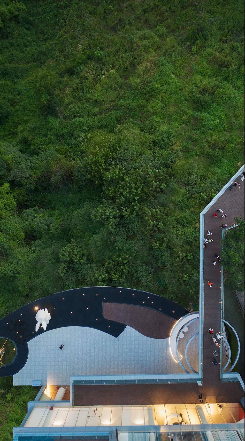 建筑整體造型融入周圍環(huán)境,同時又將設計痕跡恰當?shù)娜谌?。以中國傳統(tǒng)山水文化與美麗的自然萬象為基礎,抽象山、水、星空元素,傳遞高遠、浩瀚、璀璨的場所氣質(zhì),融通文脈,貫穿古今,讓場域活性化并帶給空間豐富的文化深度。前場景觀通過抽象的水波紋理,讓觀者感受靜謐流動的水文化。中心環(huán)道用現(xiàn)代的材料和抽象的手法,層層疊疊的臺地景觀緊扣重慶自然山地地貌。