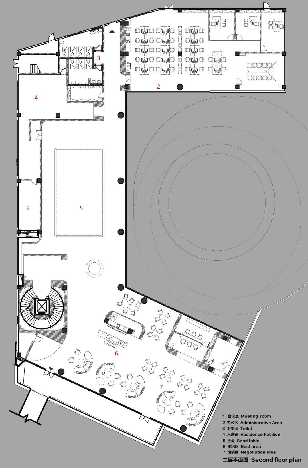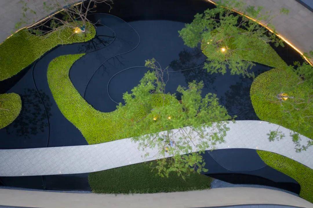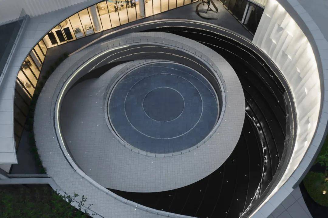 建筑師面對場所,從單純的“流動”概念出發(fā),發(fā)展出建筑的各個基本元素:形體、空間、墻面、照明。中心景觀呼應"天圓地方"哲學觀,隨著空間動線的視覺引導,在下沉空間的創(chuàng)造性轉(zhuǎn)變中,山水演化的黃金螺旋,劃分多層次立體交融空間,去除規(guī)整的直線,營造空間的沉浸式互動體驗,建構“可觀、可游、可賞”的豐富空間體驗。