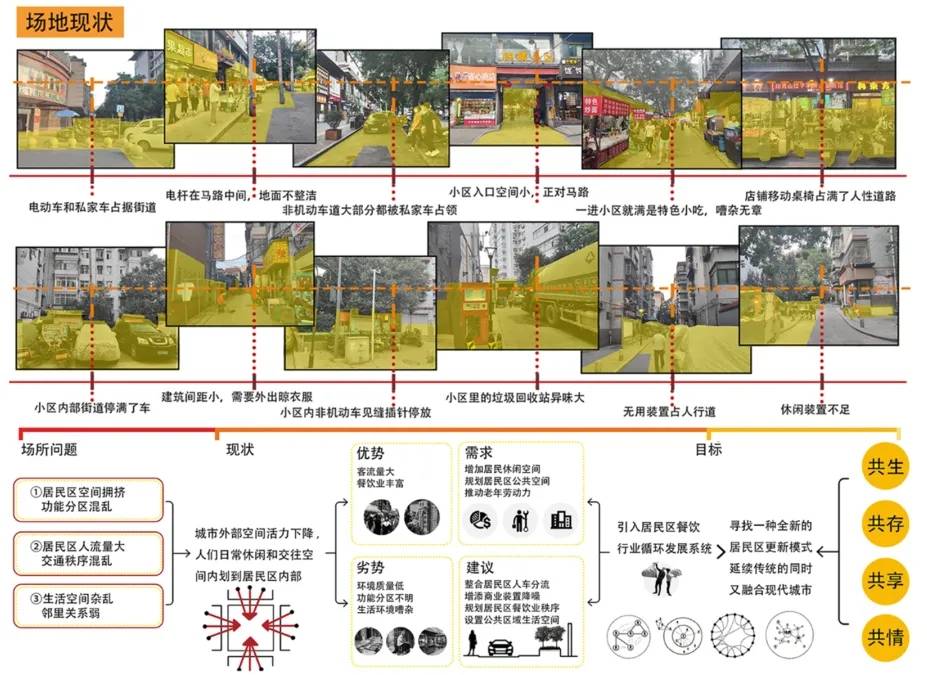 ▲ 場地分析圖:居民區(qū)空間擁擠、人流量大交通混亂、生活空間雜亂鄰里關(guān)系弱