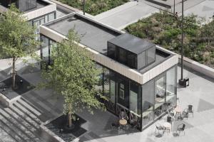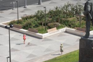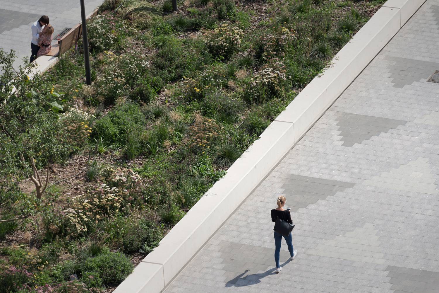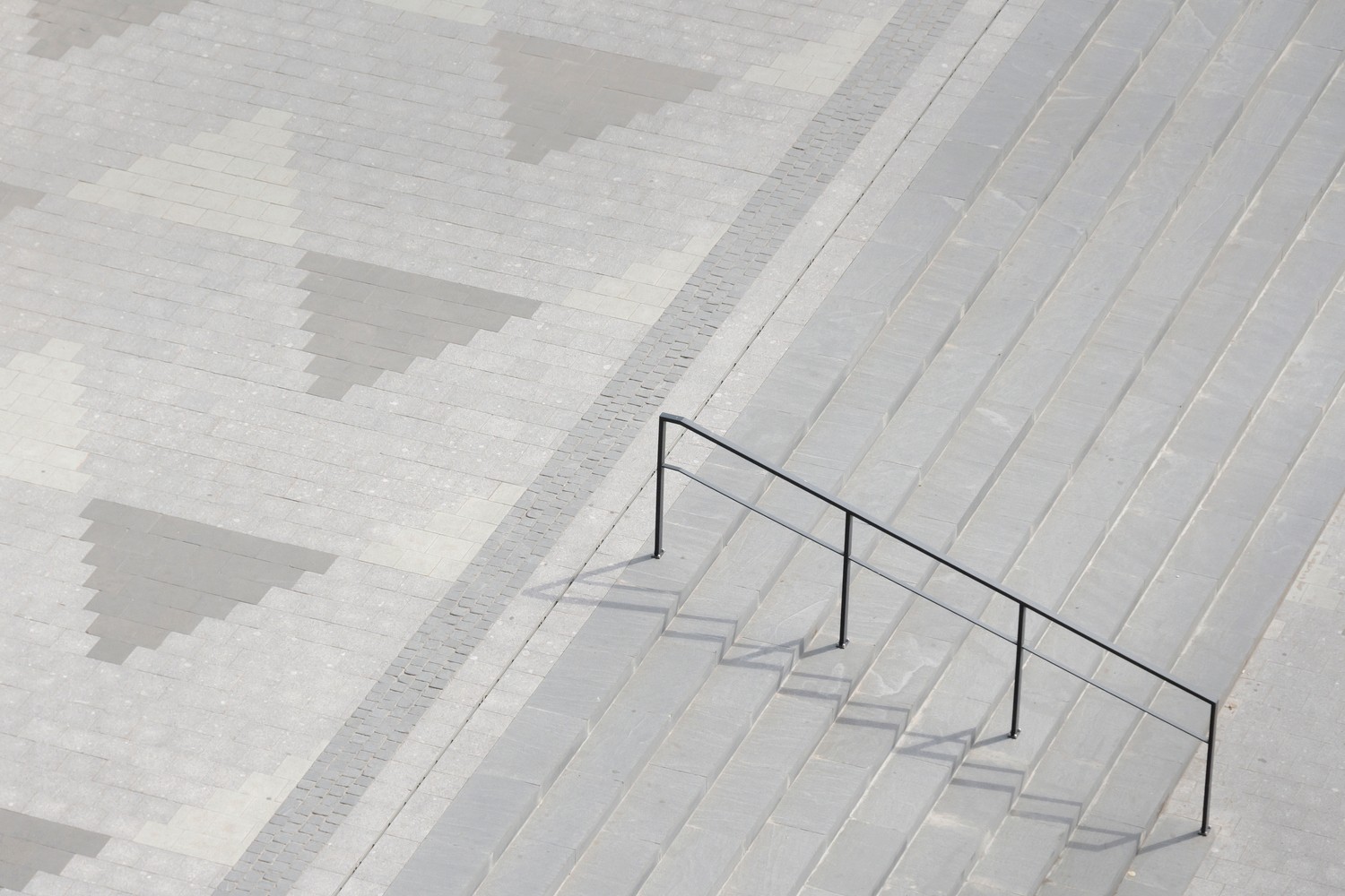 廣場表面傾斜的很嚴重,這樣會很難使用。設(shè)計師通過表面的平整和提升邊緣,可以將廣場從繁忙的街道上分隔開來。
