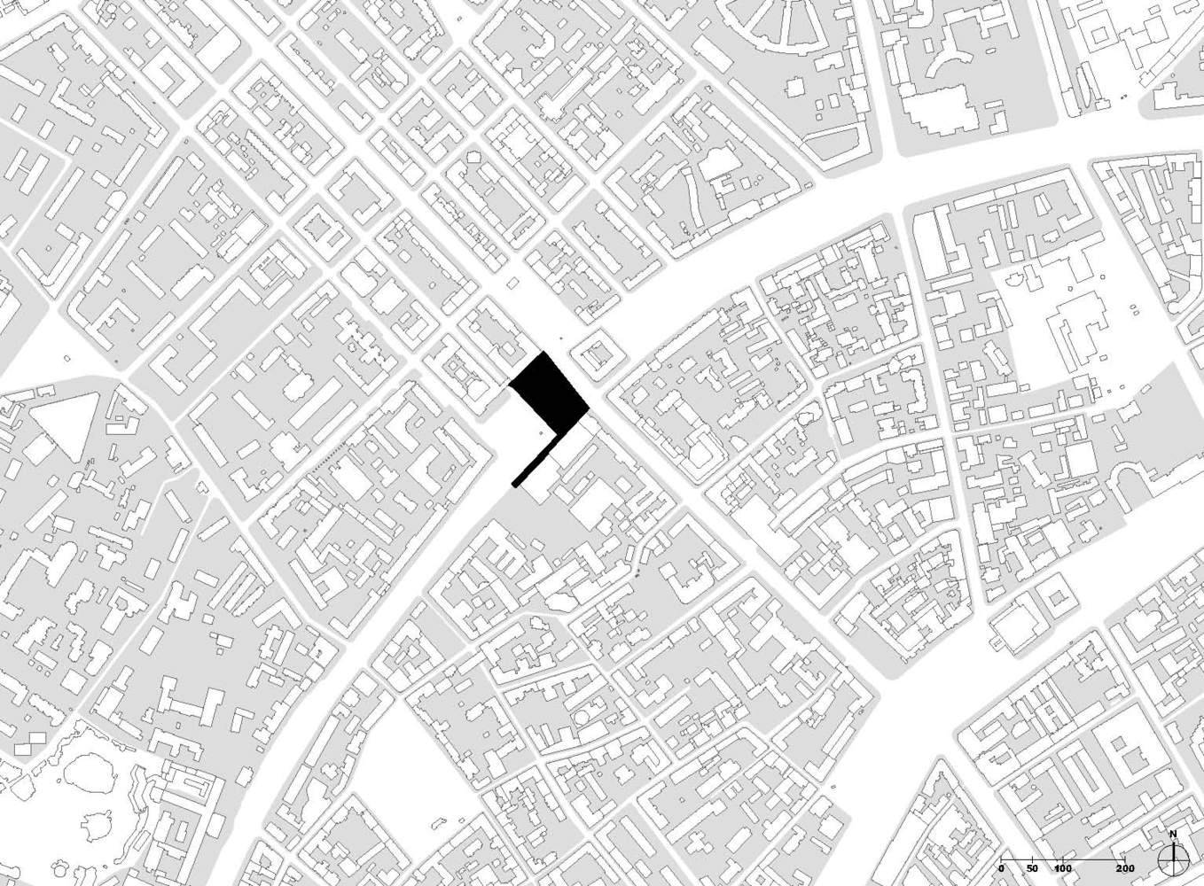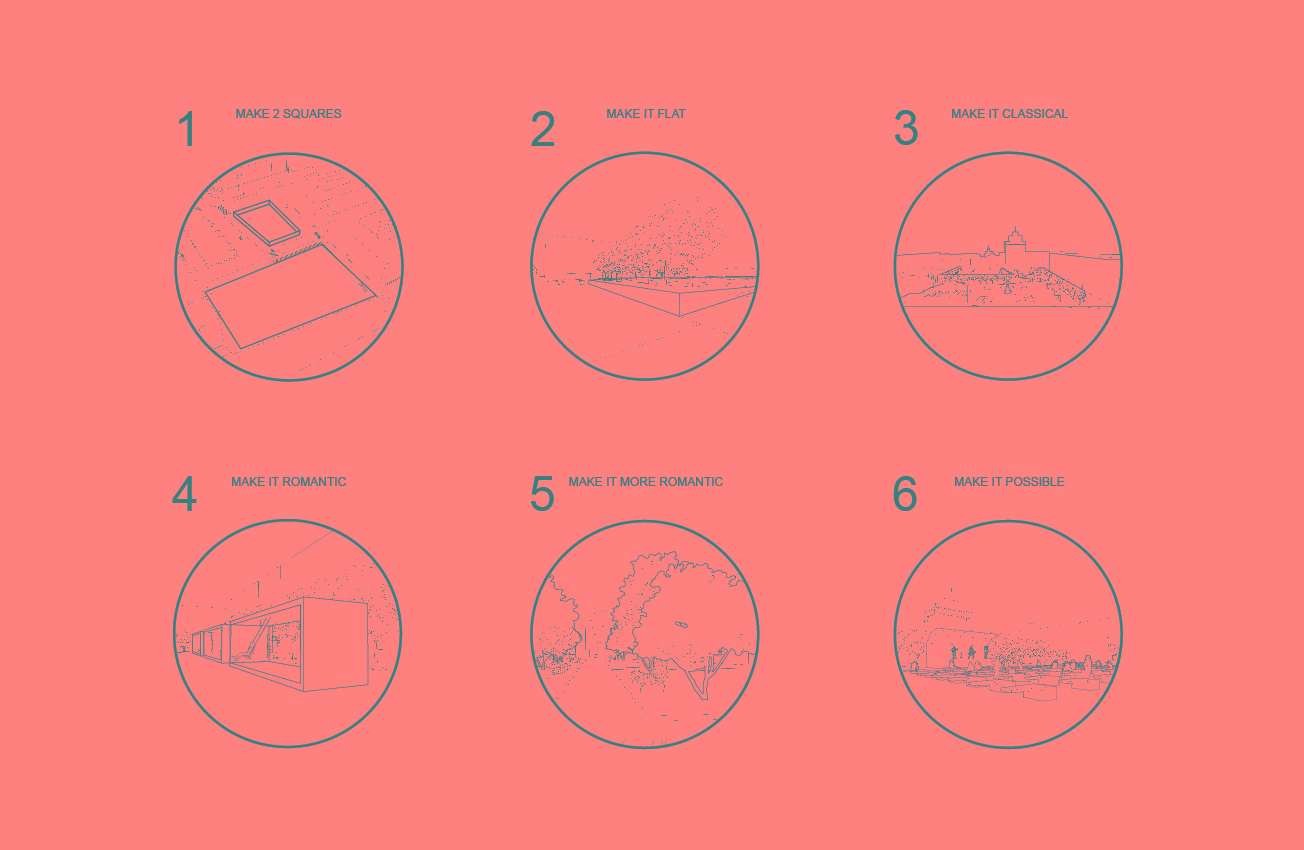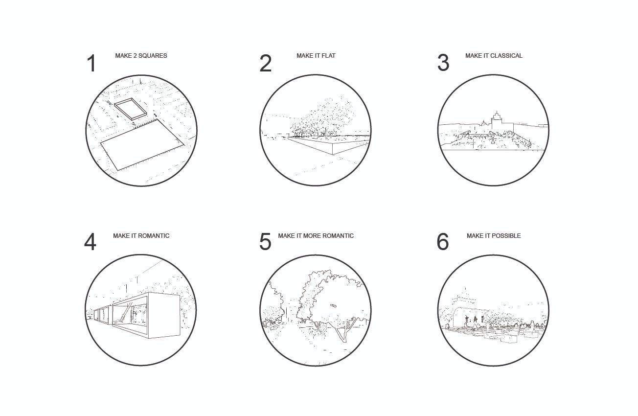 在方案中劃分了兩個區(qū)域——一個是矩形的開放廣場,另一個是由圍墻圍起來的淡紫色的花園,這有助于形成街道的交叉形狀。.