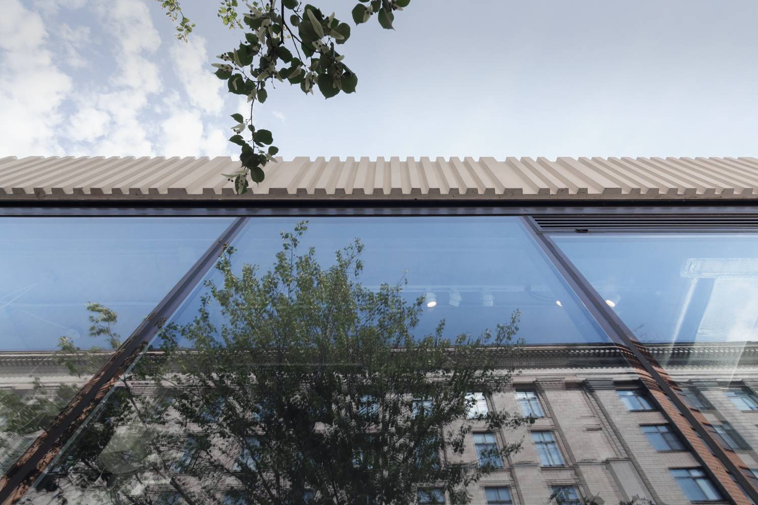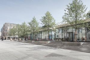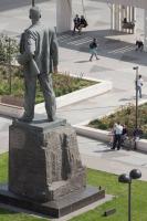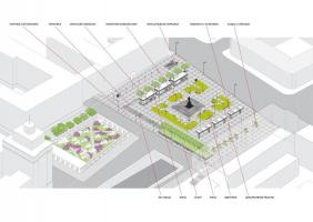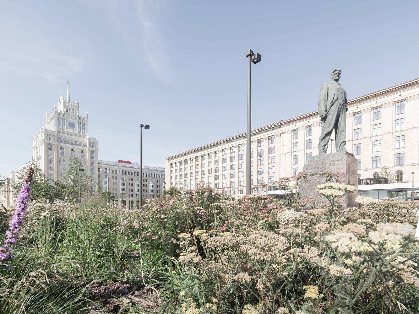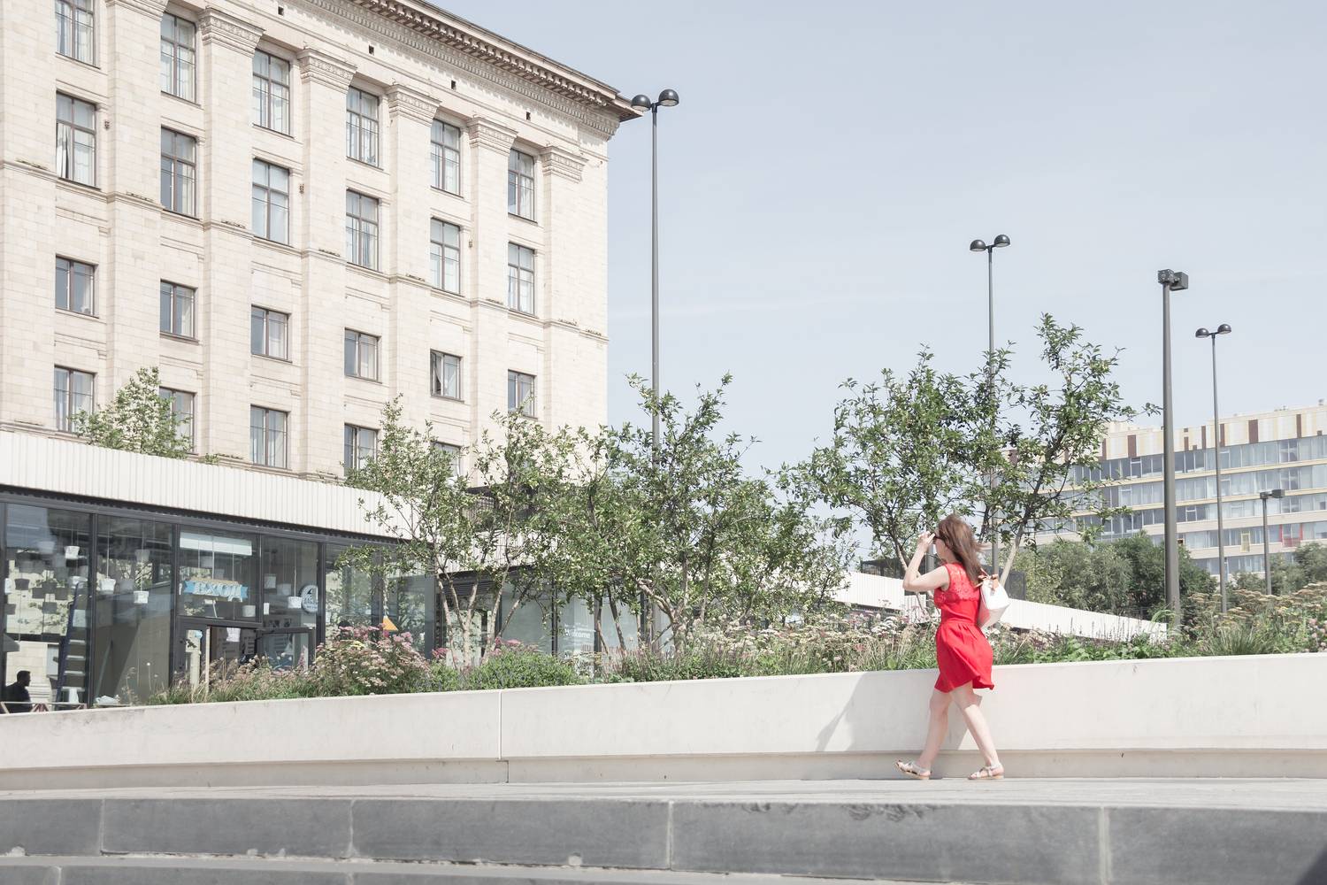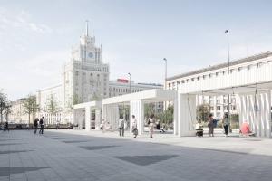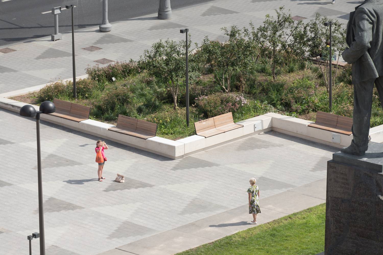 廣場是根據(jù)傳統(tǒng)的蘇聯(lián)式外墻所設(shè)計的。新的中心軸和椴樹在外圍構(gòu)成了加強版的傳統(tǒng)造型。