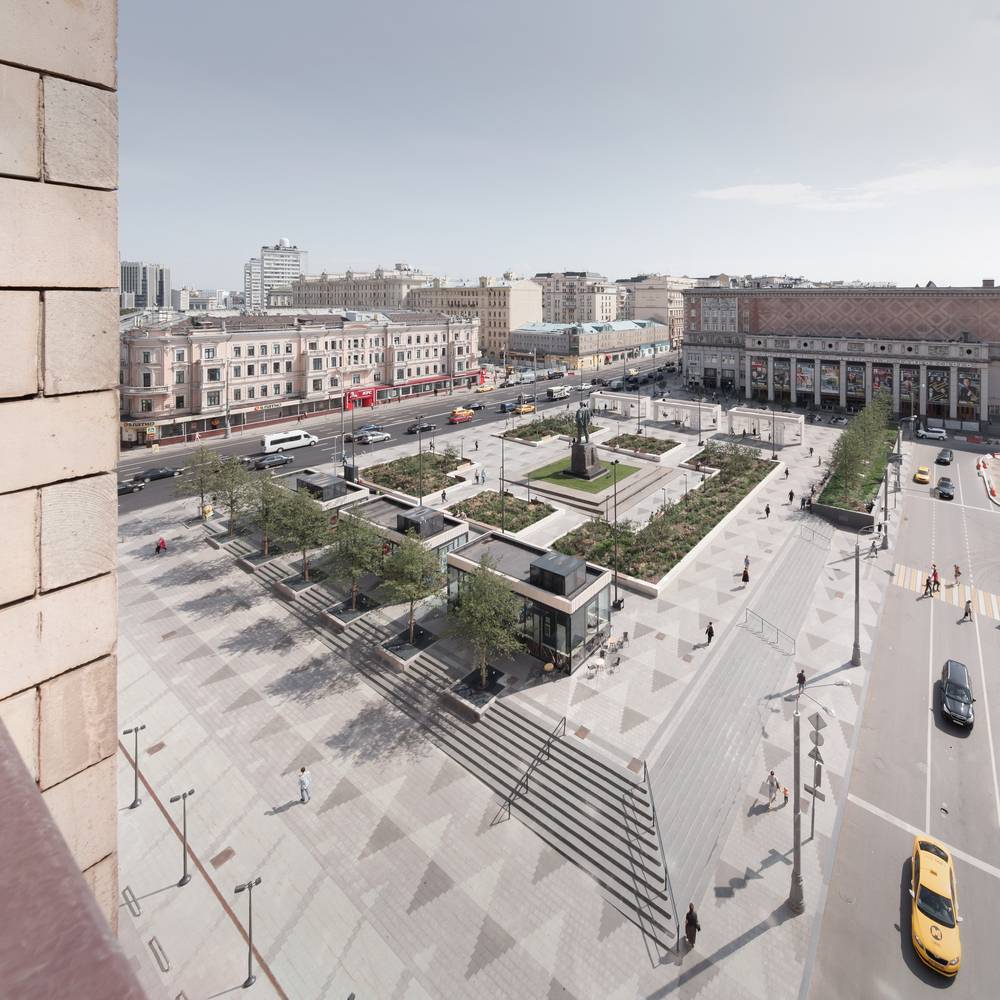 莫斯科 Triumfalnaya 廣場位于莫斯科的主干道Tverskaya街與花園環(huán)路的交叉口。在2013年首次舉行的公開設(shè)計競賽中,Buromoscow 建筑事務(wù)所贏得了競賽大獎。這次競賽的目標是要讓這里重新回到由蘇聯(lián)建筑師 Chechulin 在1958年建造的城市廣場生活當中,在過去的幾年中,這里的一半被停車占用。 Buromoscow 建筑事務(wù)所提出了5項改進措施: