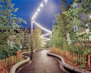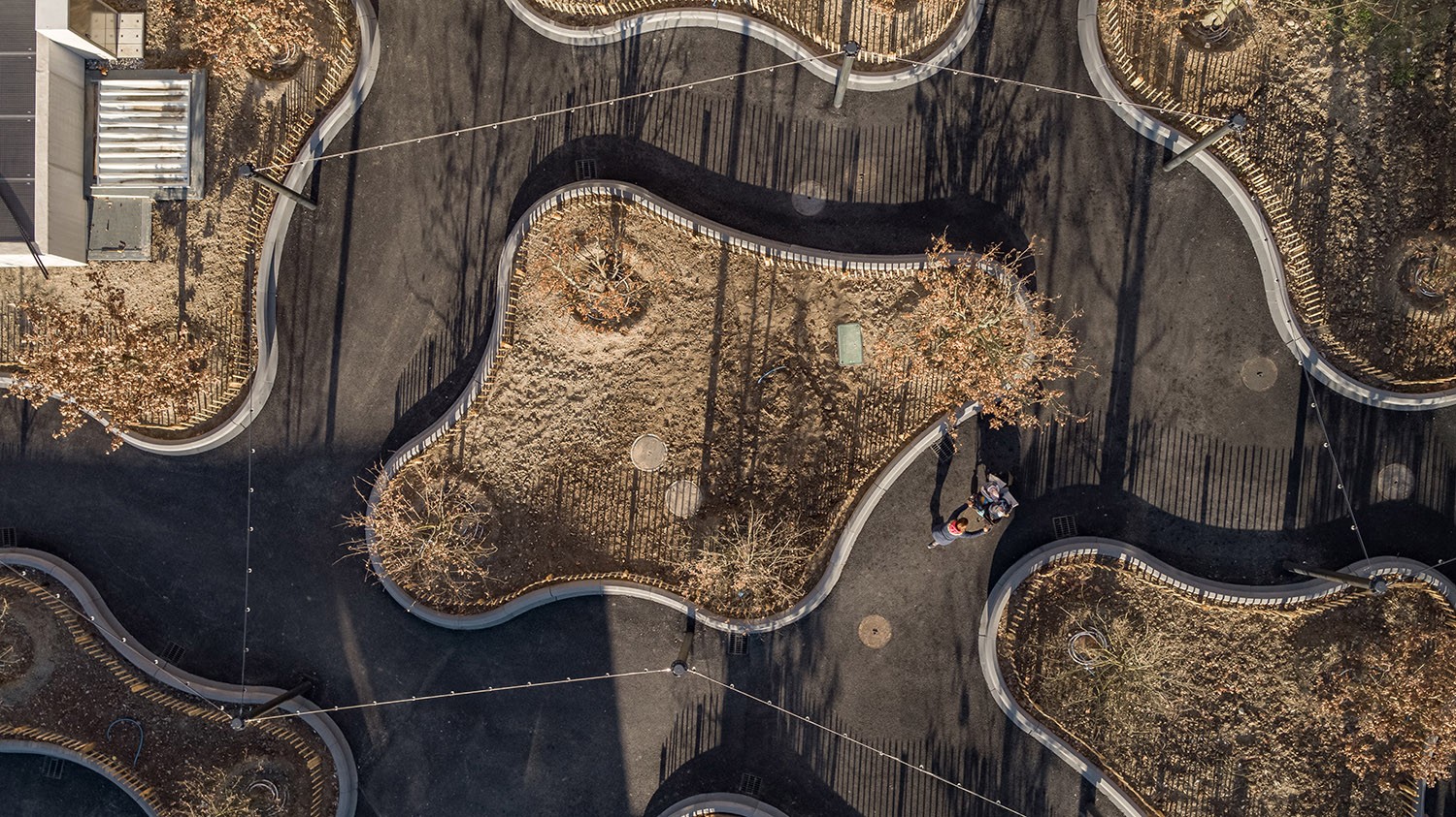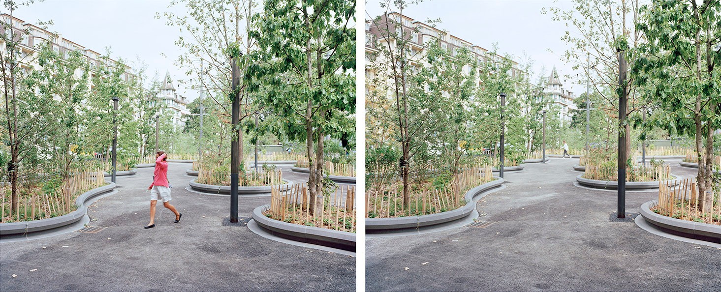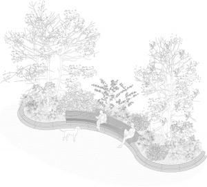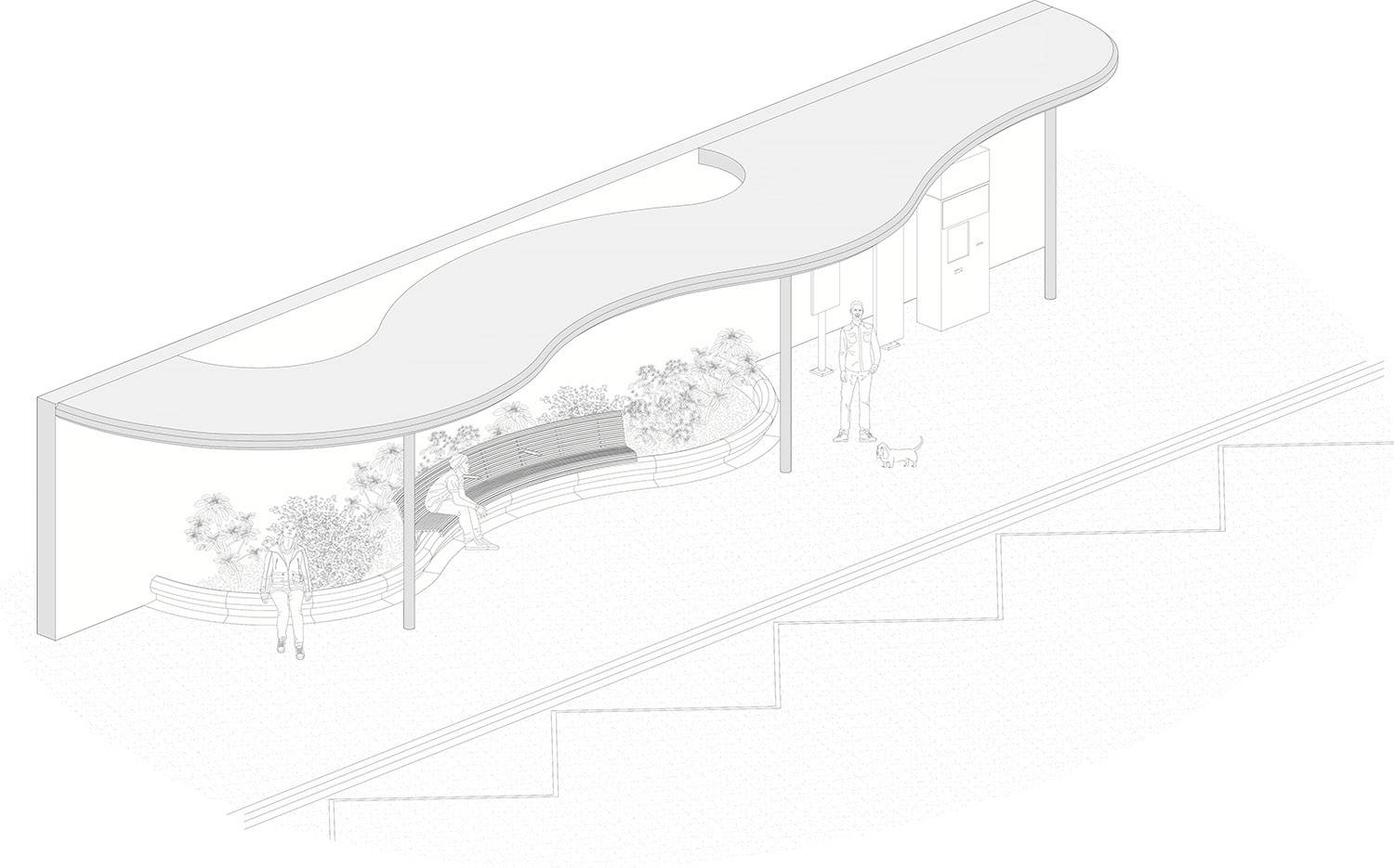 設(shè)計(jì)將簡(jiǎn)單的“種樹”想法與新區(qū)域火車線路的到達(dá)與出發(fā)結(jié)合。從地下開(kāi)始,逐漸適應(yīng)緩慢曲折的線路,形成一種在樹下和茂密的種植地面上“放浪”的體驗(yàn)。這些微型生態(tài)系統(tǒng)種植在專門的綠島上,人們不一定可以進(jìn)入。他們還有許多其他去處,比如坐在綠島的邊緣上休憩、交談,或使用專門的城市家具。
