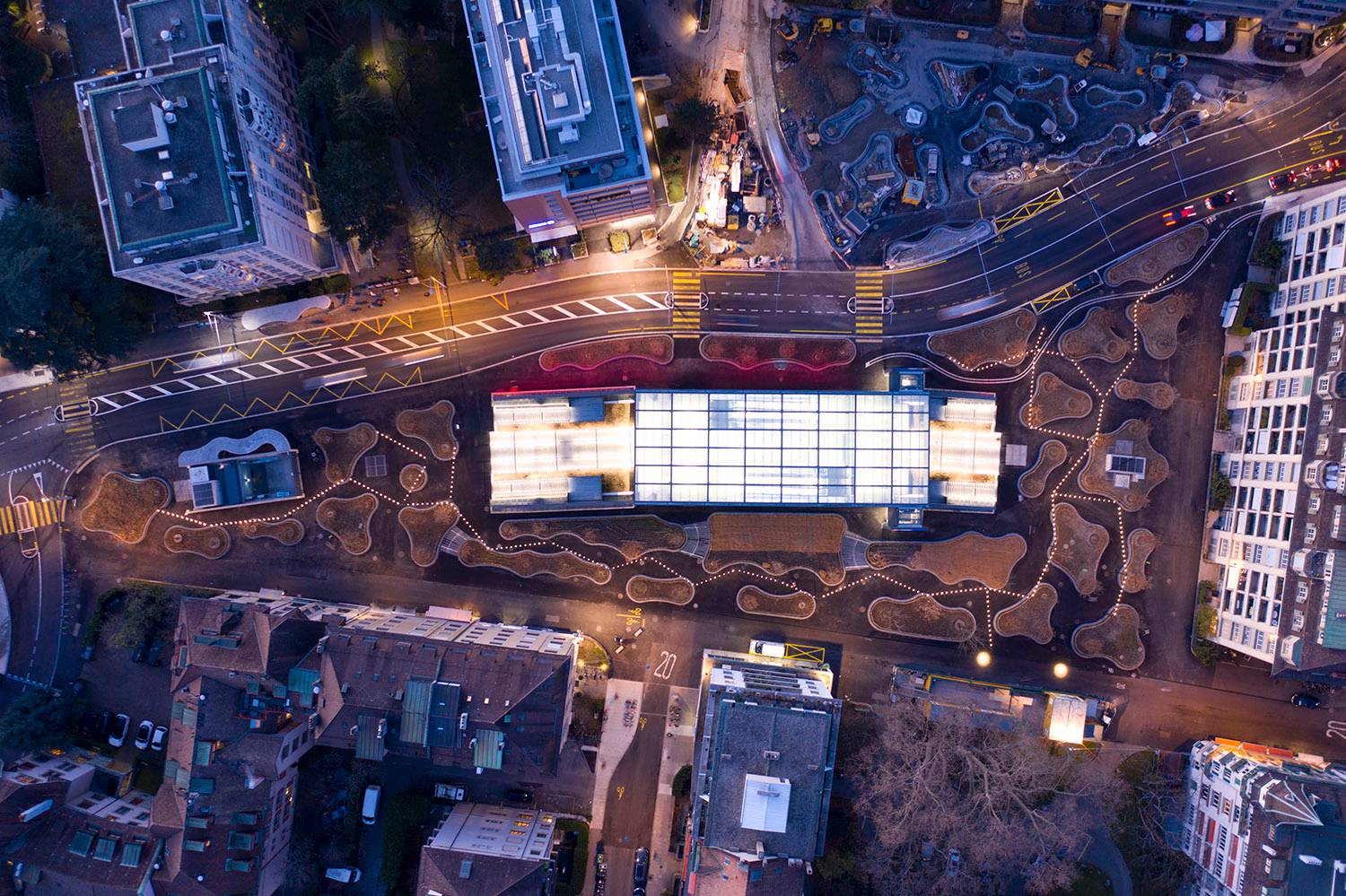 日內(nèi)瓦CEVA車站延伸了,或者說(shuō)將自己植入了多元化關(guān)系的理念中。這座由Jean Nouvel和Eric Maria設(shè)計(jì)的新基礎(chǔ)設(shè)施重新定義的日內(nèi)瓦地區(qū)的可達(dá)性,以一種友好的連接方式介入到人們的生活之中?;疖噺牡叵麻_(kāi)過(guò),人們可以上下穿行,穿過(guò)基礎(chǔ)土壤的垂直分層,進(jìn)入一片由138棵橡樹和上百種其他植物共同組成的生長(zhǎng)空間。