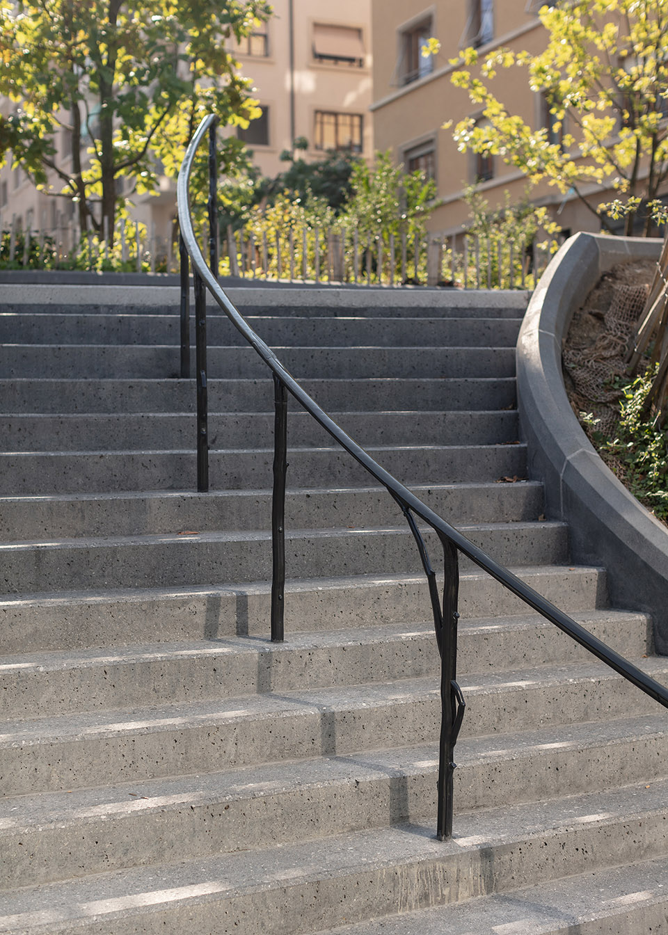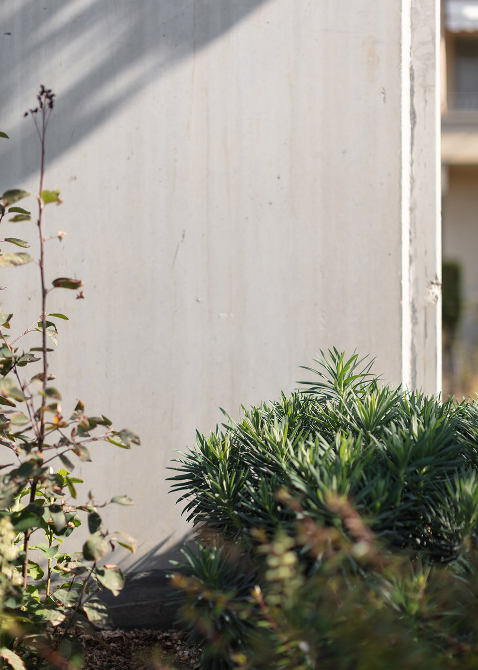 7’239 perennial plants and shrubs employed: Abelia grandiflora, Amelanchier rotundifolia, Aquilegia vulgaris, Artemisia arb.‘Powis Castle‘, Berberis vulgaris, Campanula latifolia, Campanula rapunculoides, Carex foliosissima, Carex ornithopoda, Choysya ternata, Colutea arborescens, Cornus mas, Cornus sanguinea, Corylopsis pauciflora, Cowdalis lutea, Daphne laureola, Dryopteris filix-mas, Erigeron karwinskianus, Euphorbia characias ssp. wulfenii, Fragaria vesca, Geranium cantabrigiense, Geranium macrorrhizum, Geranium sanguineum, Hamamelis mollis, Hedera colchica ‘Arborescens’, Heuchera sanguinea, Hydrangea quercifolia, Ilex crenata, Ligustrum ovalifolium, Ligustrum vulgare ‘Atrovirens‘, Lonicera nitida, Lonicera pileata, Luzula nivea, Malva moschata, Origanum vulgare, Osmanthus heterophyilus ‘Gulftide‘, Osmanthus x burkwoodii, Phlomis russeliana (samia), Polystichum aculeatum, Polystichum setiferum, Rhamnus catharcticus, Ribes alpinum, Staphylea pinnata, Stipa gigantea, Viburnum lantana, Waldsteinia ternata