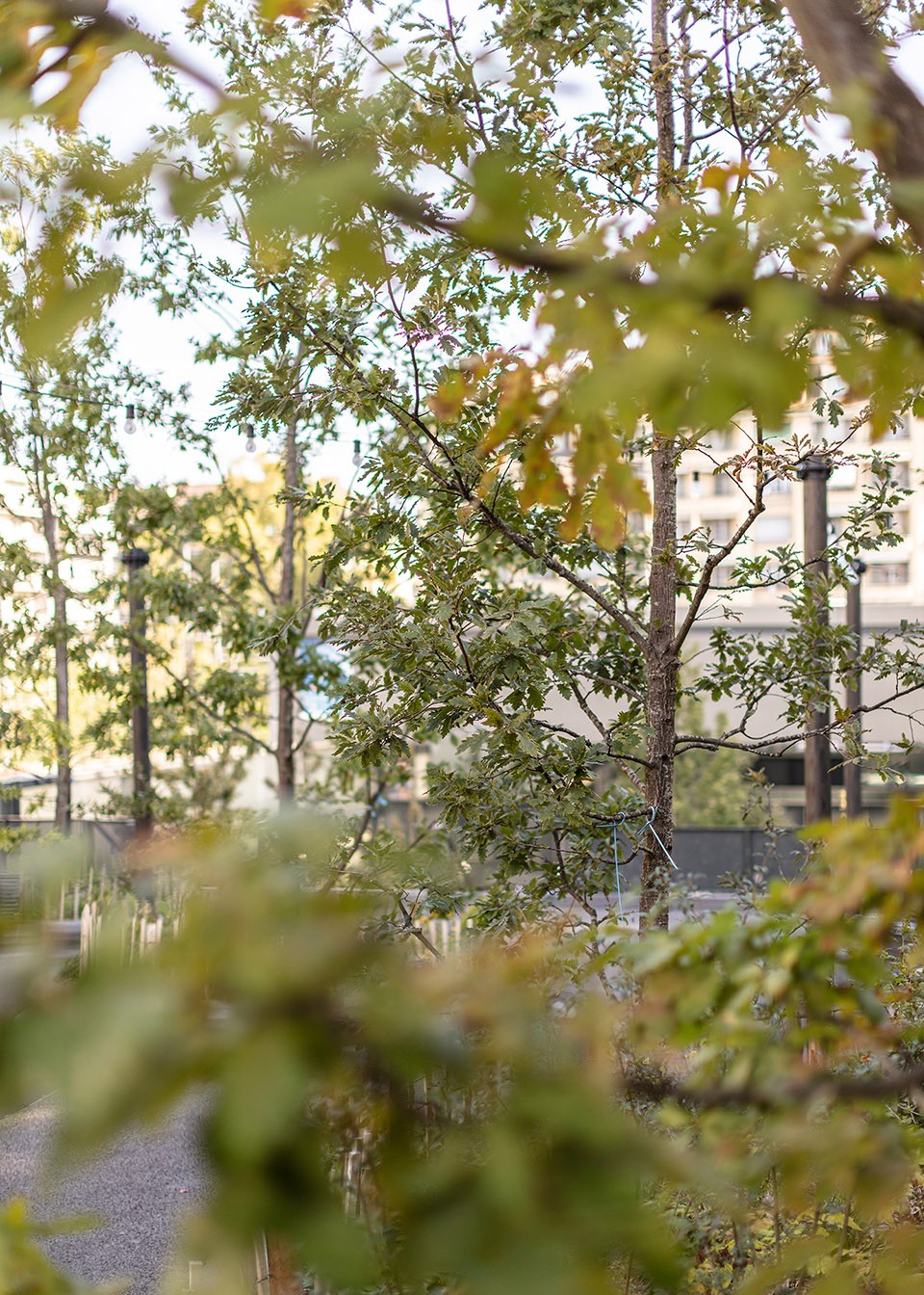 The project of the CEVA station in Geneva extends, or installs itself within this idea of multifaceted relationships. The new infrastructure, thought and designed by Jean Nouvel and Eric Maria as a piece of a network of stations redefining the Geneva region accessibilities, relates to our intervention, in a companionship connection. Trains pass by, in the underground, and people go up and down, traversing the vertical layers of the infrastructural soil, to discover a growing condition, composed of 138 oak trees and hundreds of other planted companions.