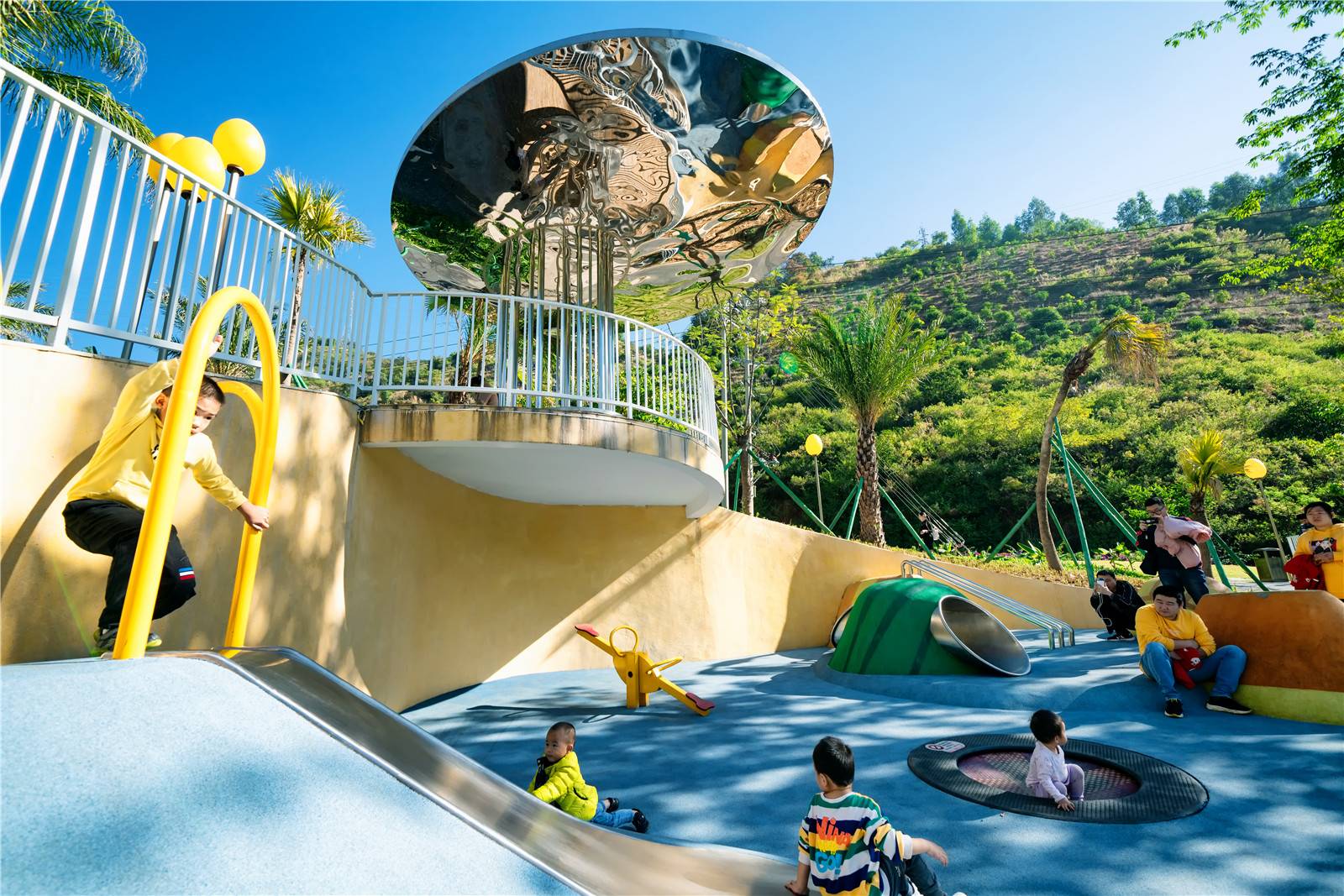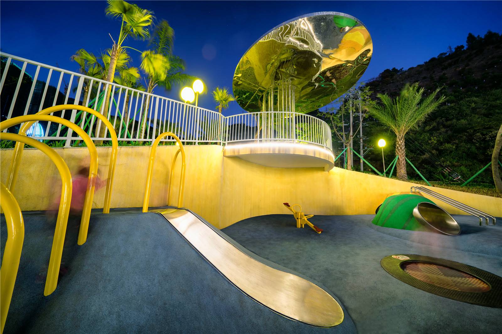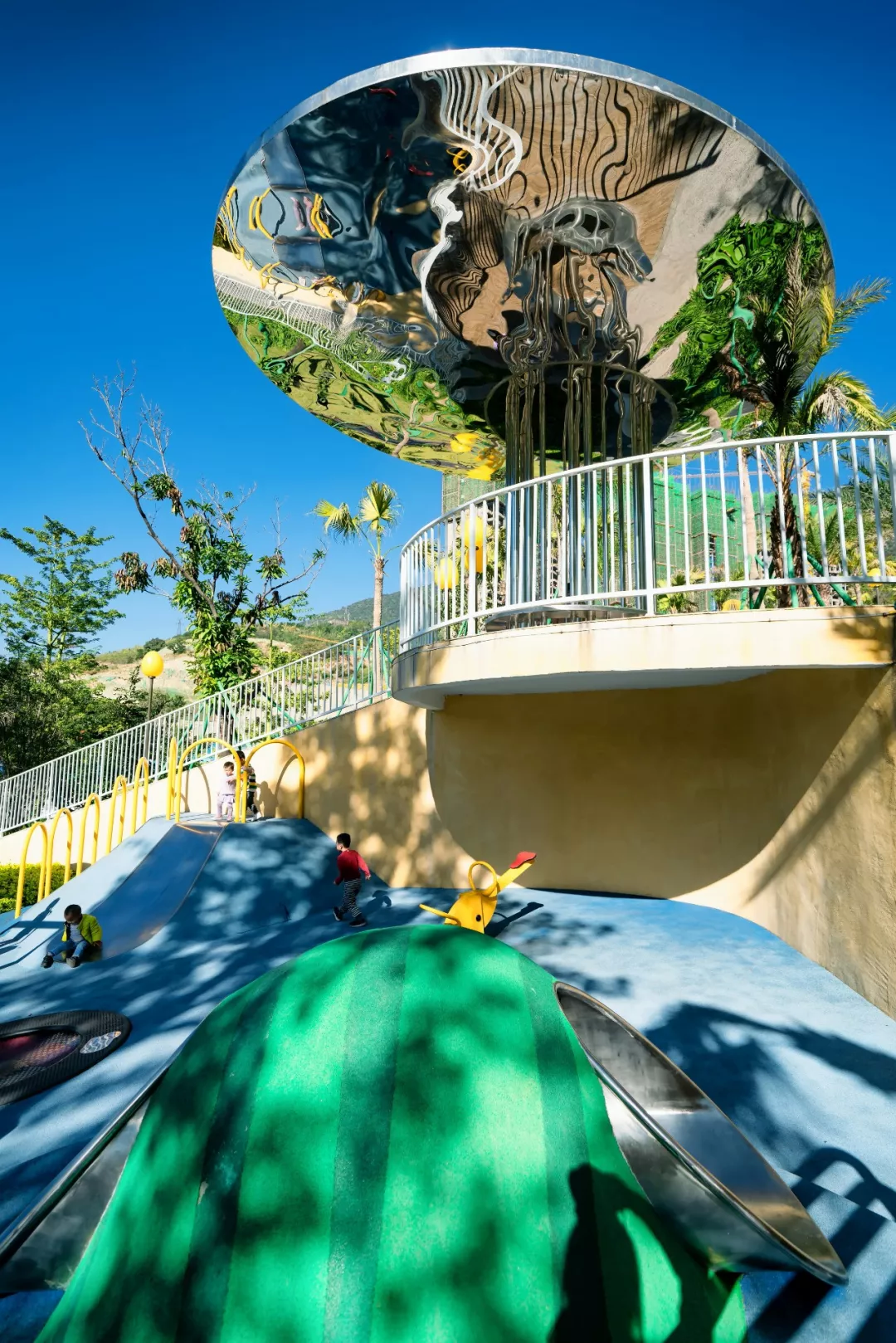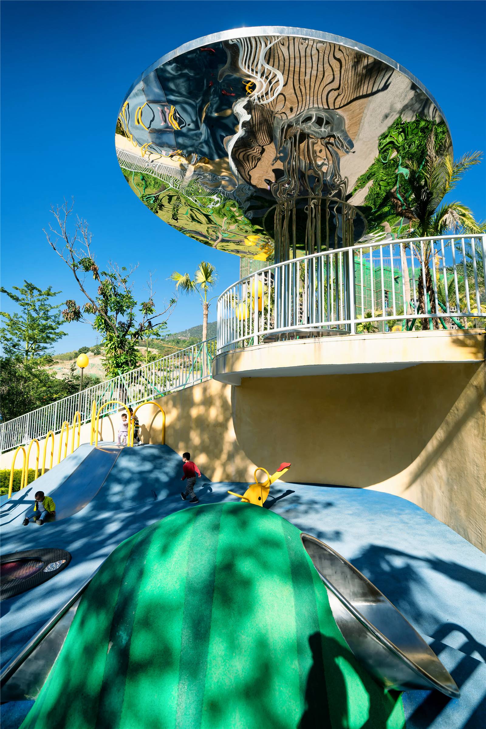 我們希望為低齡的孩子營(yíng)造一個(gè)高密度的瘋玩空間,同時(shí)希望給他們更多的想象力和迷幻感,于是我們?cè)O(shè)計(jì)了一個(gè)水果盤,用水果來(lái)藝術(shù)化游戲設(shè)施,同時(shí)在頂部設(shè)計(jì)了一面鏡子,既是遮陰休閑空間,又反射水果盤游戲區(qū),在白天與夜晚形成了不同的視覺(jué)感受。