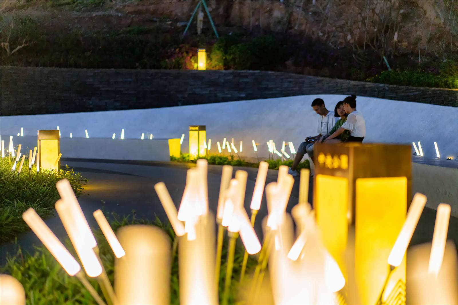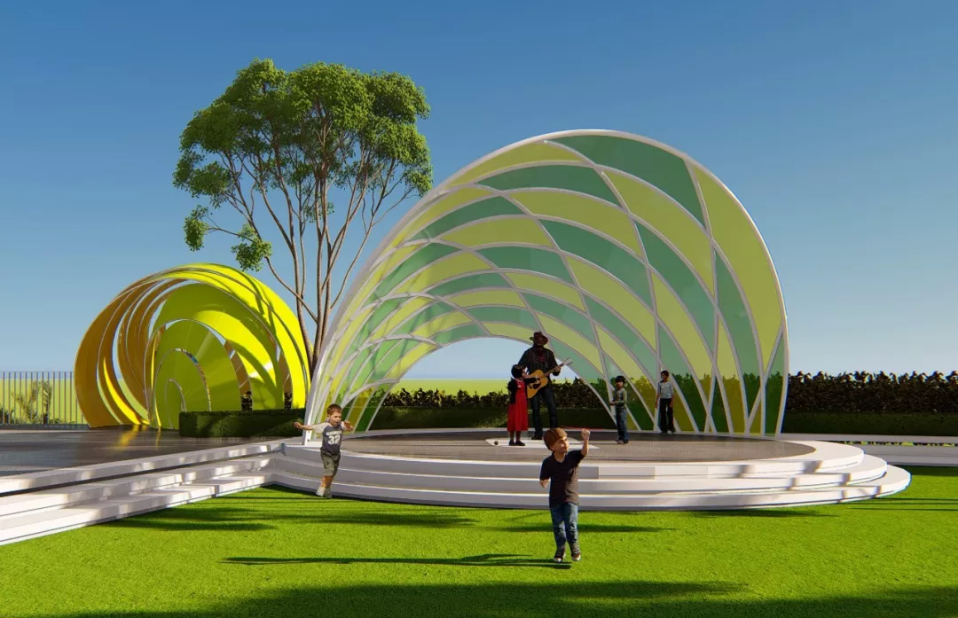 音樂(lè)社區(qū)聲音裝置與聲光電互動(dòng)裝置的運(yùn)用激發(fā)了孩子的互動(dòng)興趣與感官培養(yǎng),在這個(gè)區(qū)域,我們?cè)O(shè)置了聲音裝置、音樂(lè)草坪及菠蘿聚聲舞臺(tái),菠蘿穹頂?shù)木勐曅?yīng)使這里成為了一個(gè)不插電的家庭劇場(chǎng)。