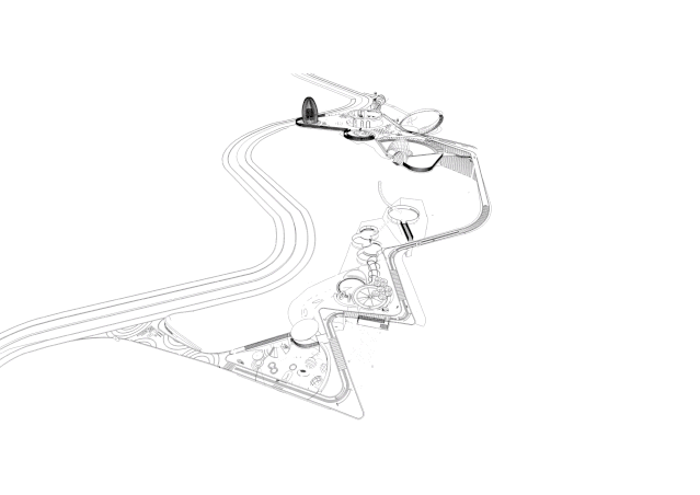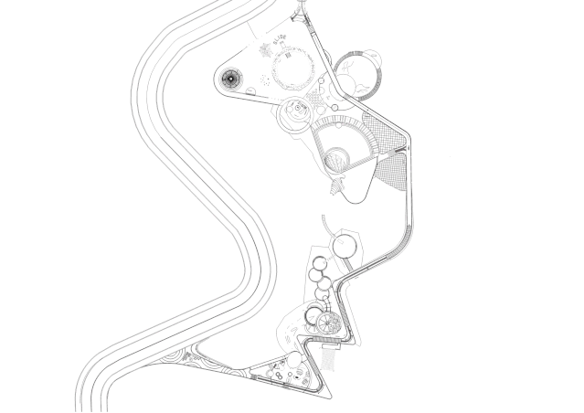 在對(duì)現(xiàn)場(chǎng)和使用功能的深入思考后,我們采用分層設(shè)計(jì)的方式解決功能的分布,同時(shí)在層與層之間利用高差進(jìn)行游戲項(xiàng)目的設(shè)置,這樣就同時(shí)化解了高差以及游戲線路的問(wèn)題。而主園路在外部銜接三個(gè)平臺(tái),作為無(wú)障礙游線。