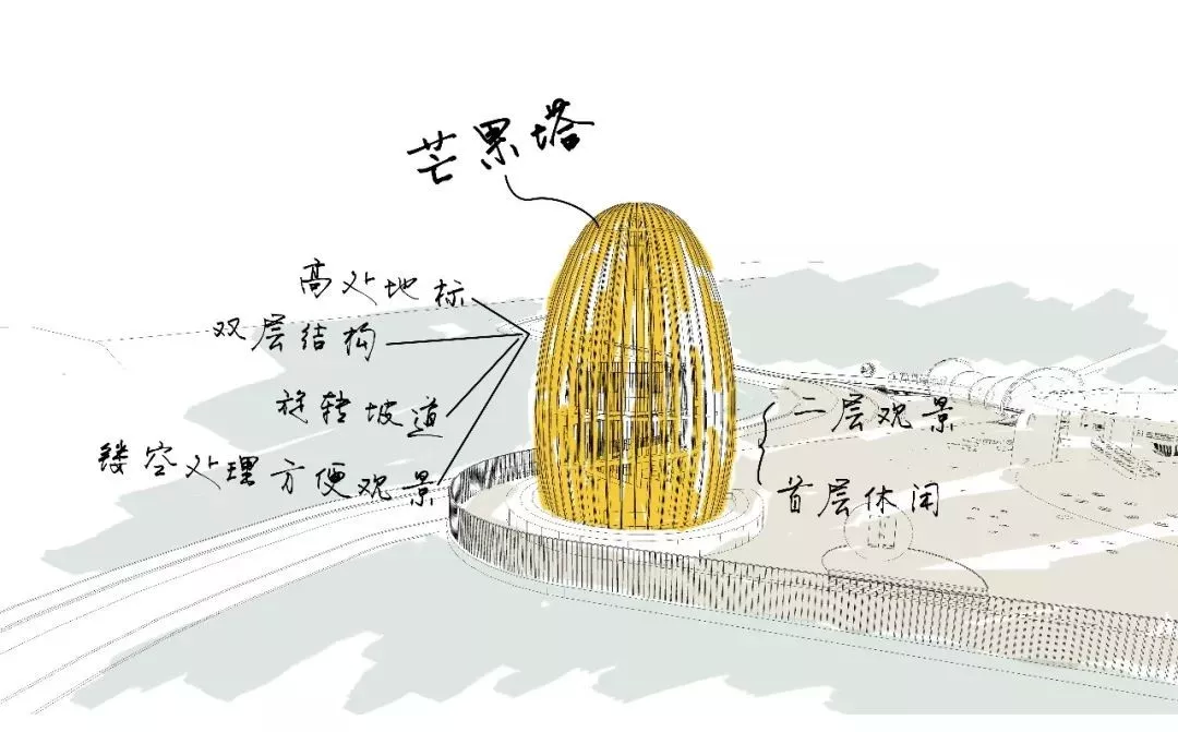 芒果塔最初的設(shè)計(jì)愿景是在最高點(diǎn)打造一個(gè)具有觀光功能的地標(biāo)構(gòu)筑,采用雙層設(shè)計(jì),一層遮陰休閑、二層觀景。
