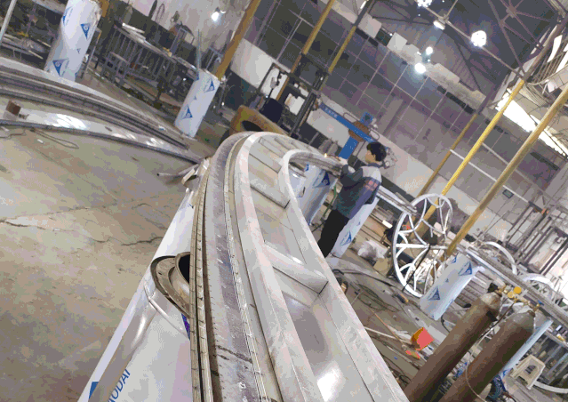 現(xiàn)場(chǎng)定點(diǎn)與安裝:最終48根柱體在現(xiàn)場(chǎng)實(shí)現(xiàn)組裝,定位中心原點(diǎn)與每一根柱體的位置后實(shí)施焊接,焊接的難點(diǎn)是精準(zhǔn)每一根柱體的定位,保證美感。