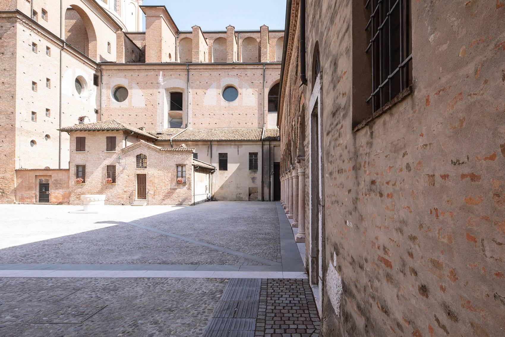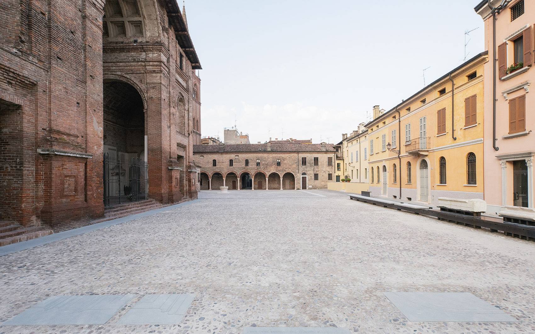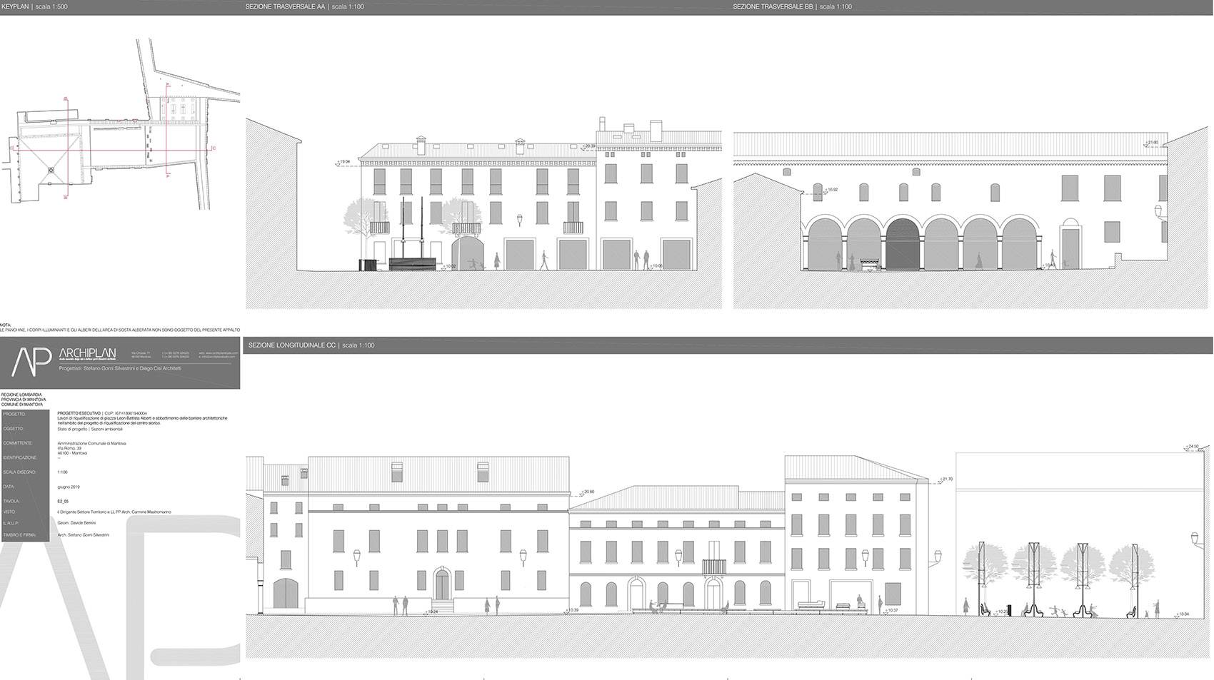 To separate the main places of the monumental space and the areas destined for commercial activities, a threshold was provided consisting of some engraved plates celebrating the intellectual figure of Leon Battista Alberti placed on the ground. This choice is linked to the lapidary tradition of the historic city which in Mantua has numerous and extraordinary examples; above all the front of the Bertani house and the churchyard of Santa Maria della Carità.