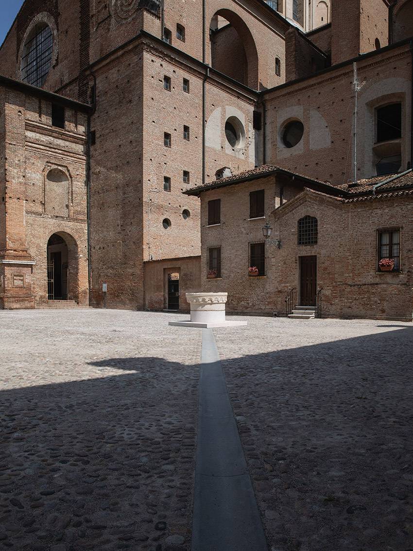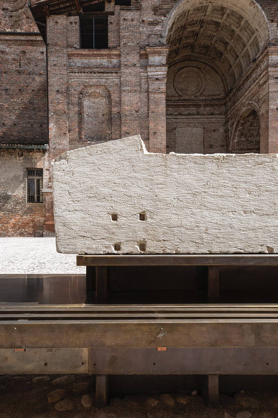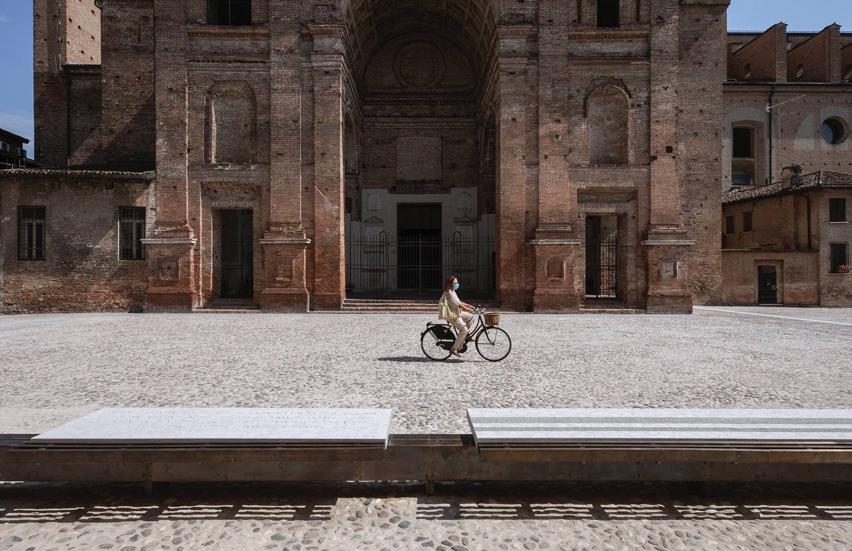 為使主要紀念空間與商業(yè)空間形成明顯的分區(qū),場地周邊的地面上設有一系列帶有浮雕的大塊地磚,地磚上以線條的形式抽象出 L.B. Alberti教堂的形象,起到了分界的效果。這一設置與這座歷史名城的寶石傳統(tǒng)息息相關,可以視作曼圖亞典型的建筑特色之一,由貝爾塔尼宮的正立面和圣瑪利亞教堂的墓地便可看出。