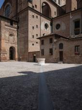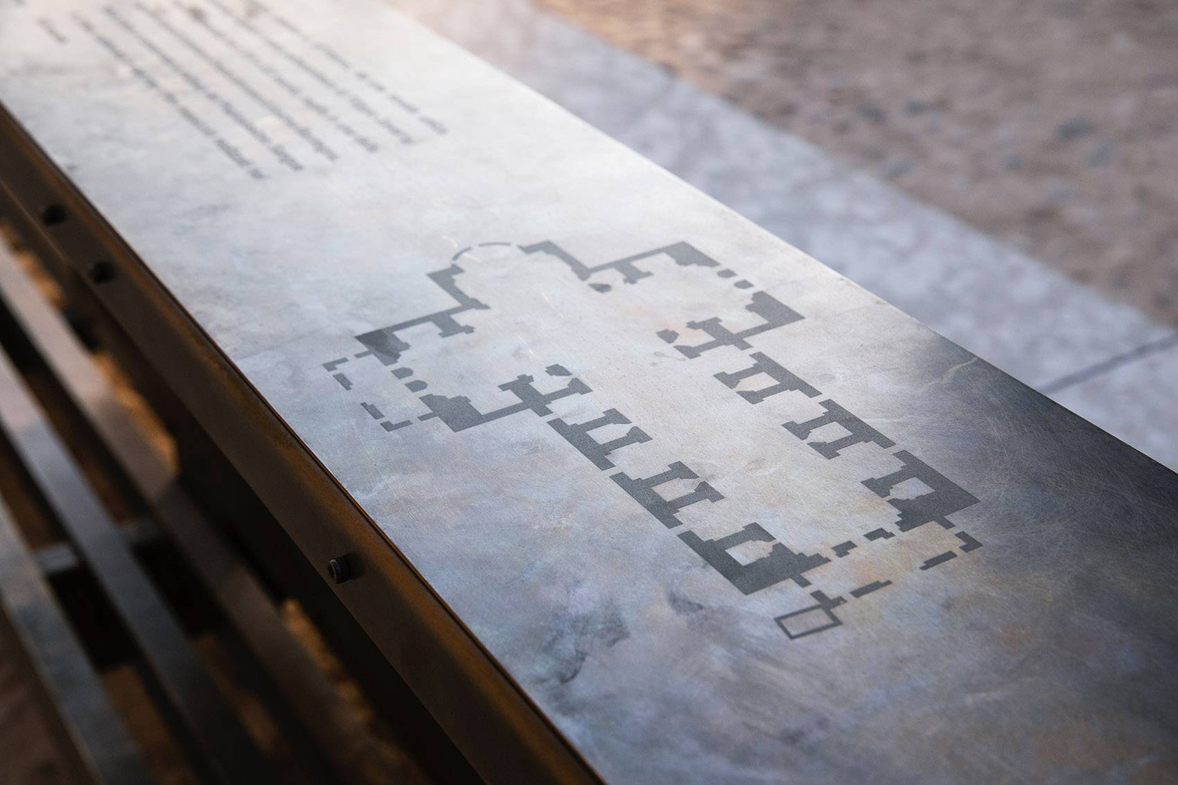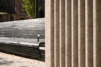 在教堂華麗的阿爾伯蒂式(Albertian)立面的對面,佇立著一架青銅結構的長凳。長凳上擺放有一系列石制構件,包括帶有教堂平面的石板,供視覺障礙人士閱讀的盲文浮雕說明,一些在該巴西利卡式教堂改造中替換下來的石材樣本,以及一塊刻有銘文的石板。這些元素使人聯(lián)想到教堂地窖中保管的圣器,彰顯出祭禮建筑的起源。此外,青銅結構的另一端還形成一段帶有垂直靠背的座椅,并提供了一些基本游客信息。