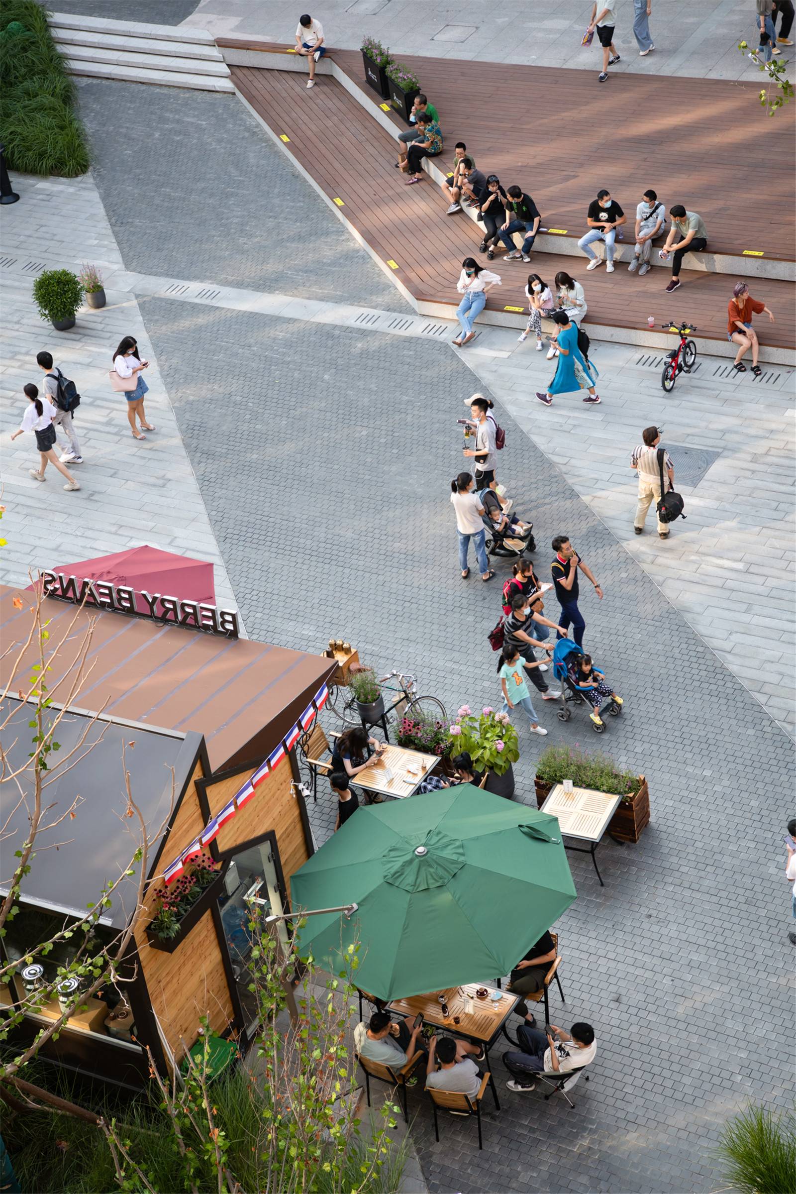 如果只有空間,小街的設(shè)計(jì)也許只呈現(xiàn)了一半,而另一半則是靠對(duì)未來使用場(chǎng)景的想象,對(duì)于望京這樣一個(gè)大量外籍人員與本土居民共融的大型生活社區(qū),商業(yè)空間的功能與氛圍需要與每個(gè)社區(qū)居民的日常息息相關(guān)。設(shè)計(jì)過程中“煙火氣”始終貫穿始終,有別于大排檔和夜市,這里的“煙火氣”我們更愿意理解成為是一種場(chǎng)所的活力,商業(yè)的繁榮,公眾的參與以及社區(qū)的融合。