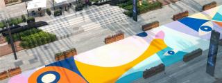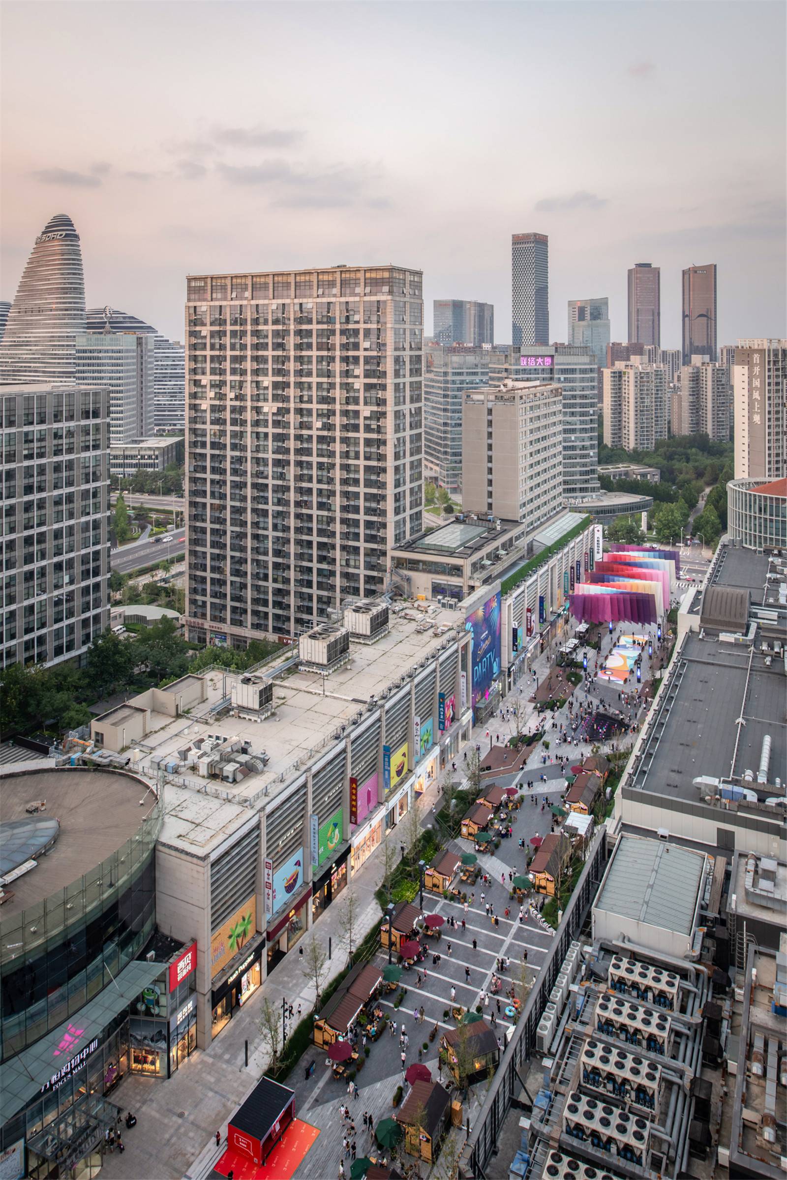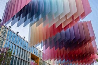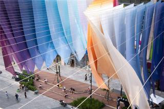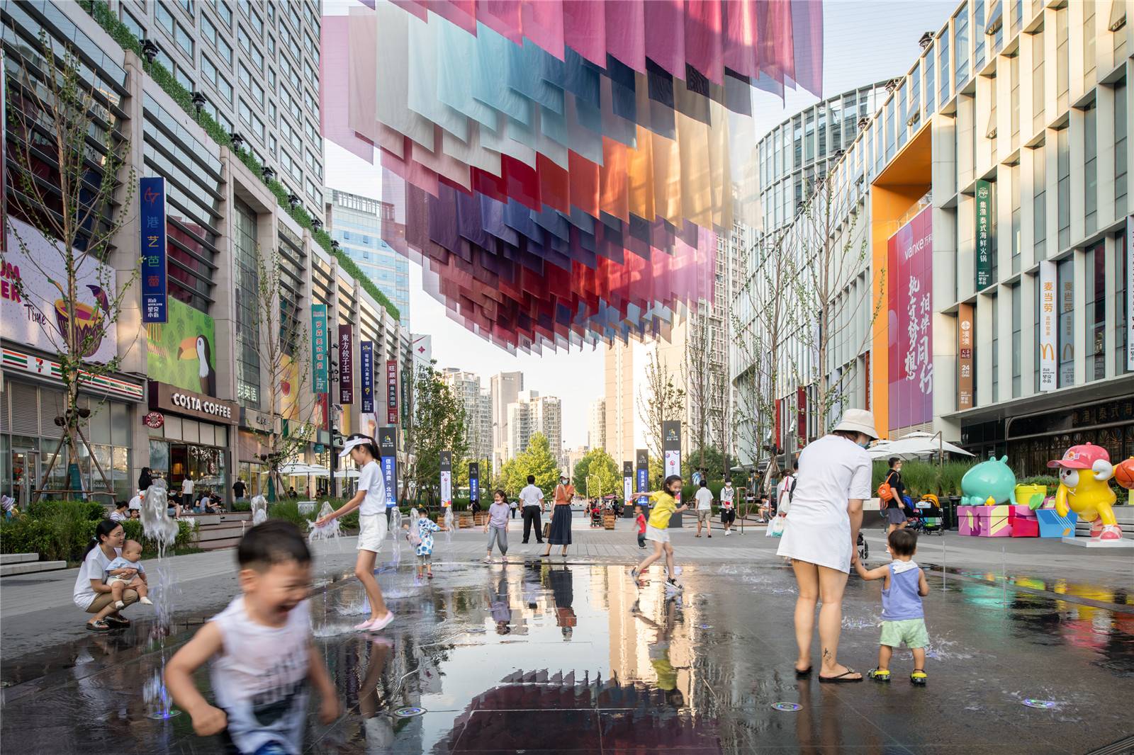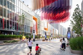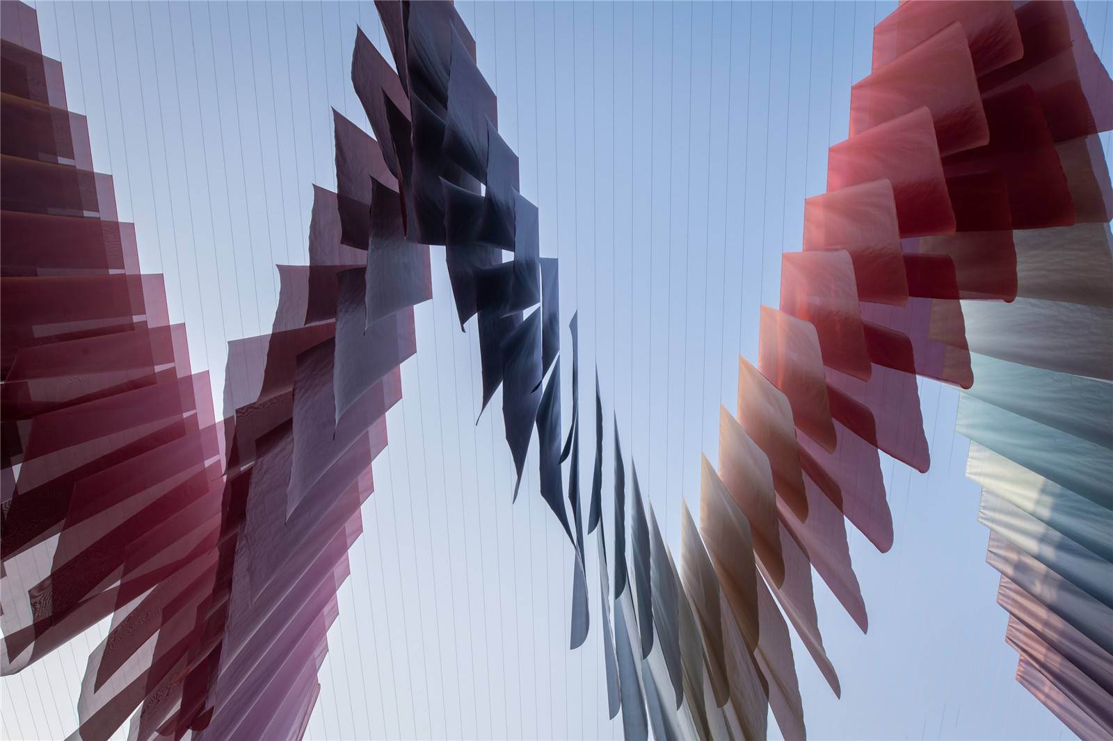 小街臨近798和中央美院,片區(qū)藝術(shù)氛圍濃厚,景觀作為最受歡迎的公共空間,成為了展示藝術(shù)與文化的載體。而小街上最搶眼的藝術(shù)裝置是懸掛在空中的由輕質(zhì)半鏤空的PVC材質(zhì)做成漸變色塊并通過120根不銹鋼拉伸而成,既是視覺中心也是“縫合”街區(qū)的重要介質(zhì)。