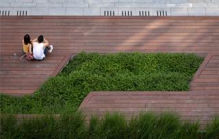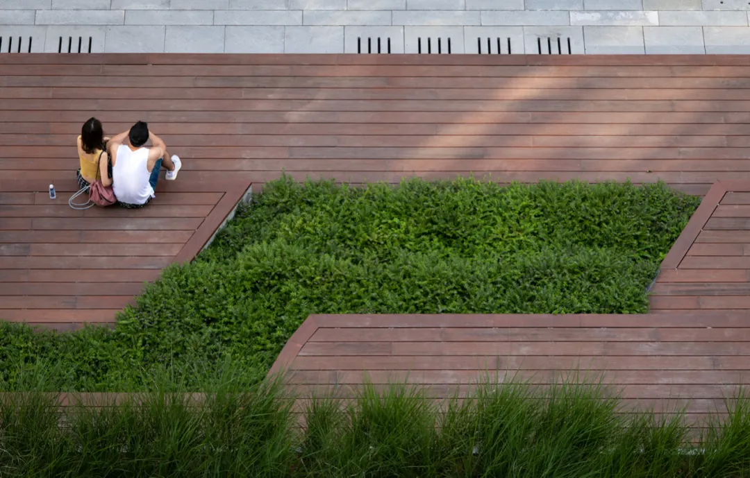策略2. 利用兩側(cè)人行空間和高差改造為木質(zhì)大看臺(tái),結(jié)合階梯式綠化,形成小街活動(dòng)的觀演劇場(chǎng)式空間。