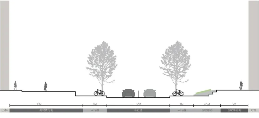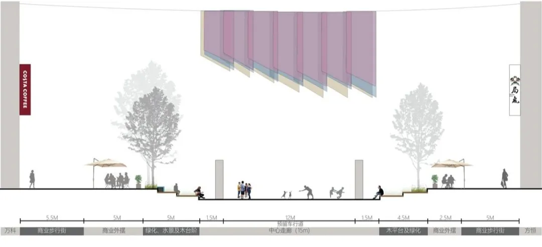 策略1. 步行街保持原12米車道路寬度不變,預(yù)留應(yīng)急通車需求,同時(shí)可為休閑活動(dòng)及商業(yè)活動(dòng)留白。