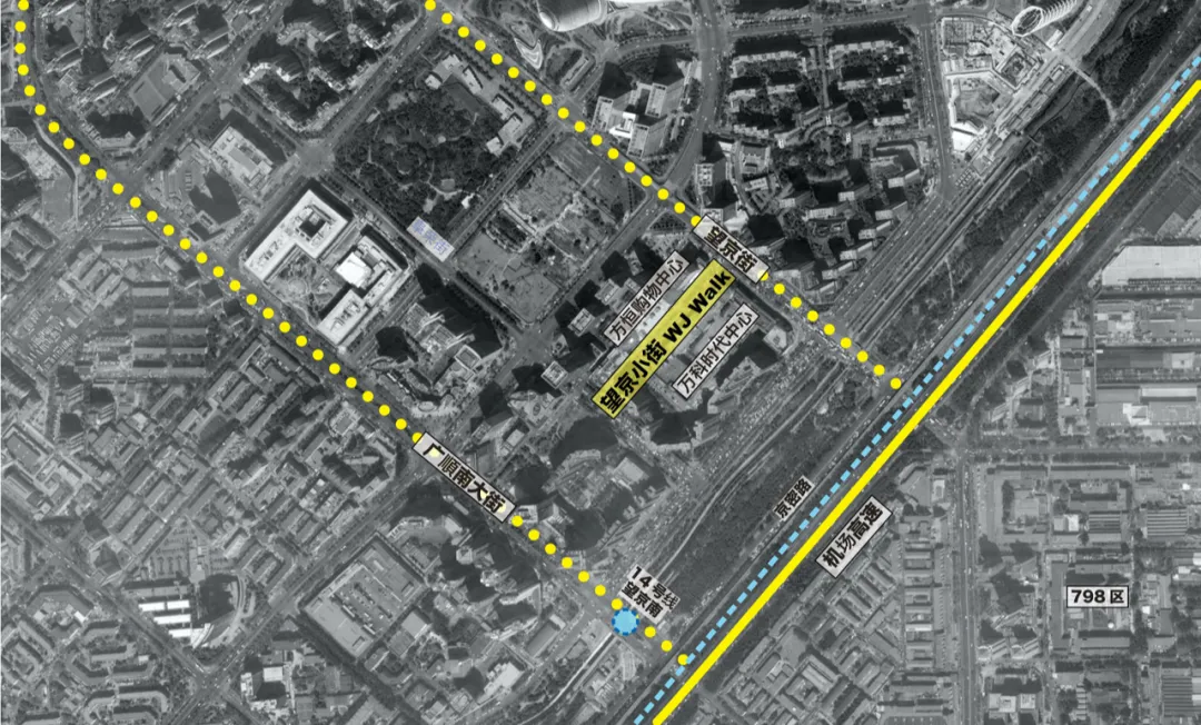 望京小街位于北京朝陽區(qū)望京片區(qū)臨近機(jī)場(chǎng)高速大山橋西側(cè), 北連望京街,南通阜榮街,全長360余米,寬約40米,夾在萬科時(shí)代中心和方恒購物中心之間。這條13年的老街,在經(jīng)歷兩年多的規(guī)劃設(shè)計(jì)以及五個(gè)月的改造施工后,重回人們的生活。