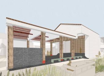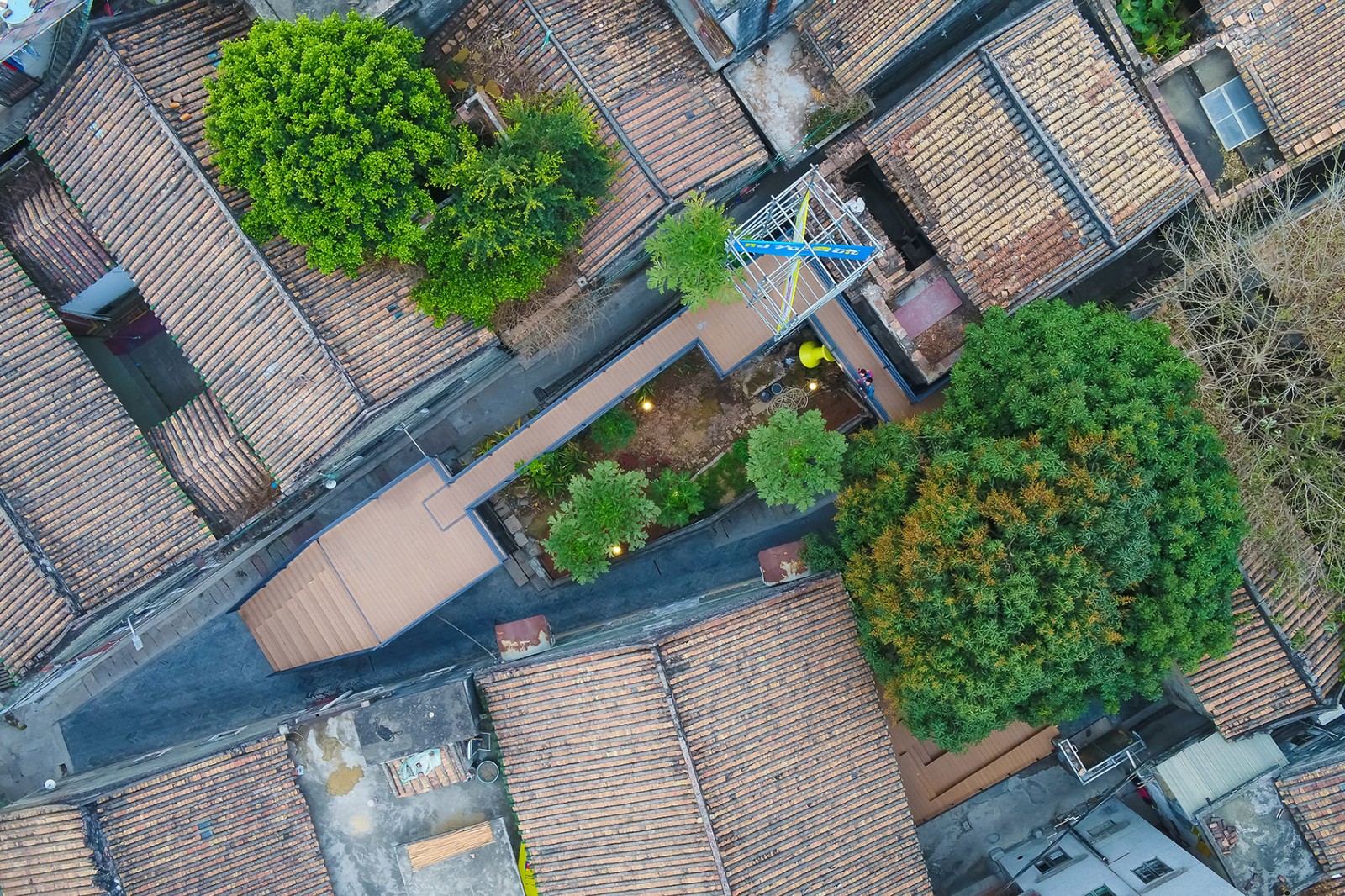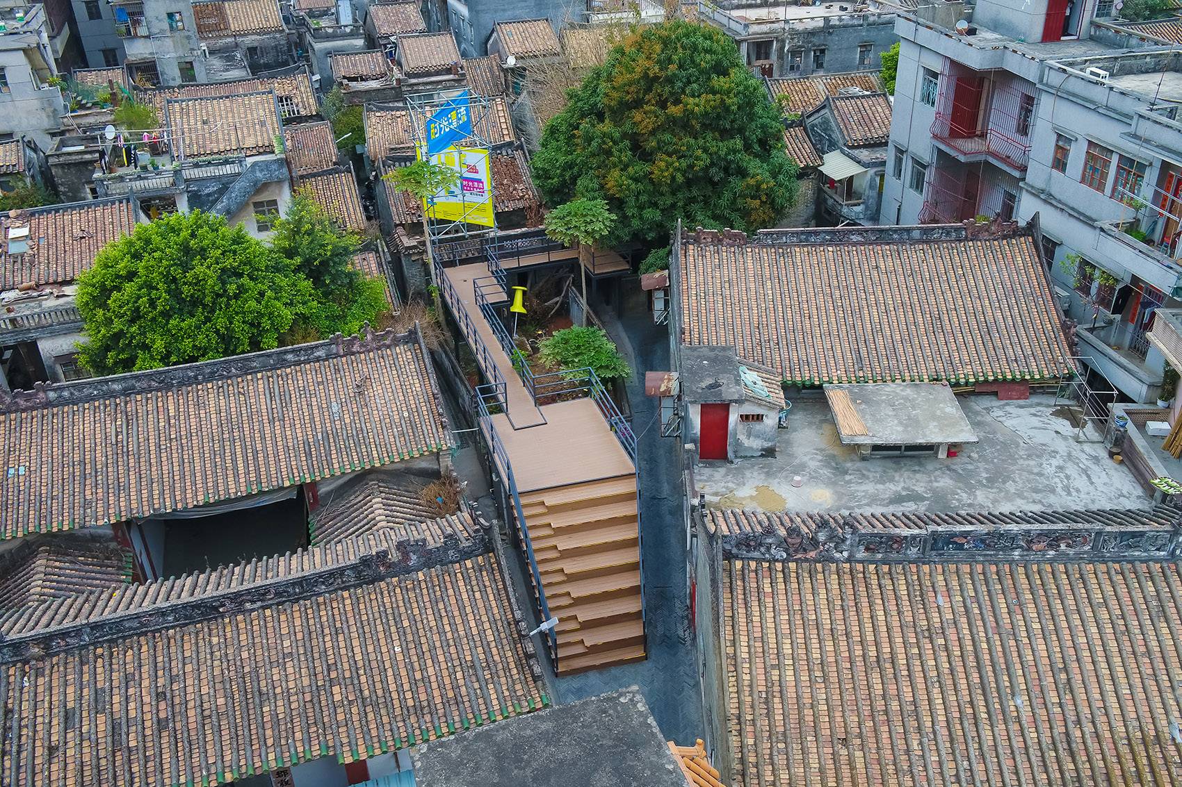 There is a building ruin near the pulbic stage, and after a period of time some residents grow vegetables here. Architects used the roof of the public toilet beside the ruins to construct a sky bridge system, including a large staircase, a skywalk, a Scaffolding poster towers, etc., People are allowed to walk up to the second-story elevation and get a closer look at the historic buildings, including two shrines and a home school. At the same time, the small open space on the side of the ruins was utilized and transformed into an outdoor plaza with wooden planks where villagers can sit and relax or engage in small social and sporting activities,such as practicing mantis boxing