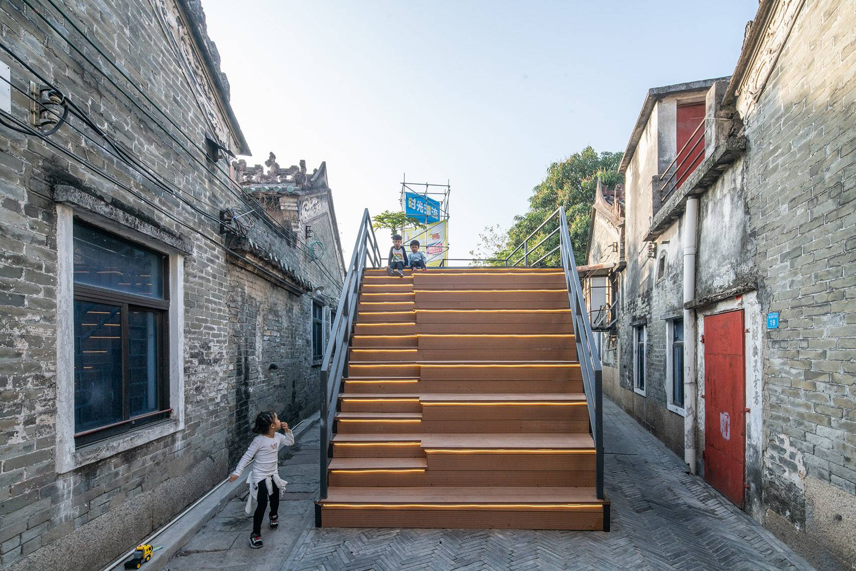 在戲臺附近有一處建筑廢墟,長期荒廢變成了雜草叢生的空地,有居民在此種菜。建筑師利用廢墟邊的公共廁所屋頂,順勢設(shè)計了一個空中廊橋系統(tǒng),包括大臺階、空中棧道、腳手架海報塔等,讓人們可以走到二層標(biāo)高,近距離觀賞近在眼前的歷史建筑群(包括兩個祠堂、一個家塾、環(huán)繞周邊的老建筑群)。同時,利用廢墟一側(cè)的小空地,將其改造成為室外廣場,鋪上木板,可以坐在此處休息,也可以從事小型交往、休閑、聚會、體育活動(比如在此練習(xí)螳螂拳)。