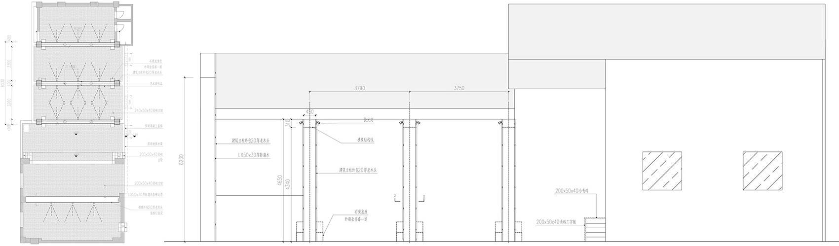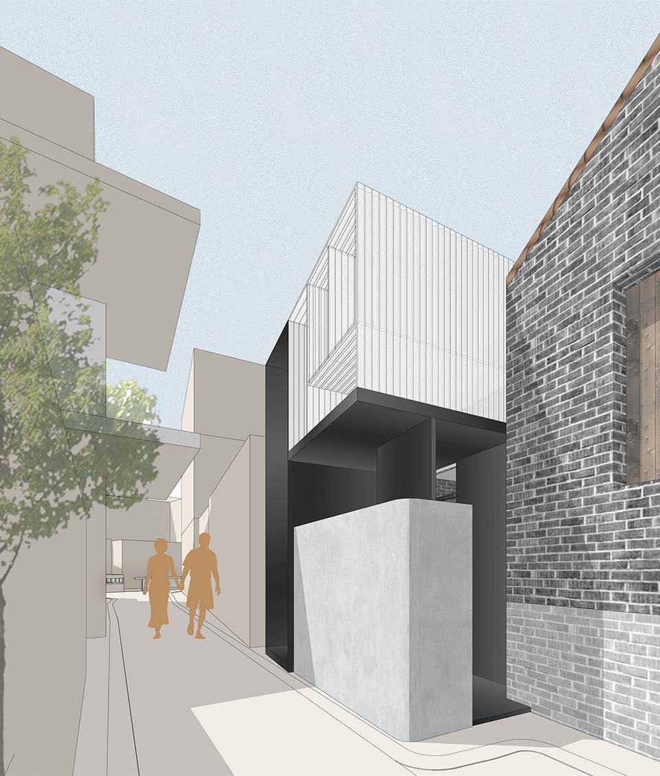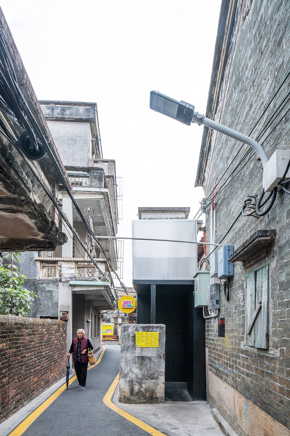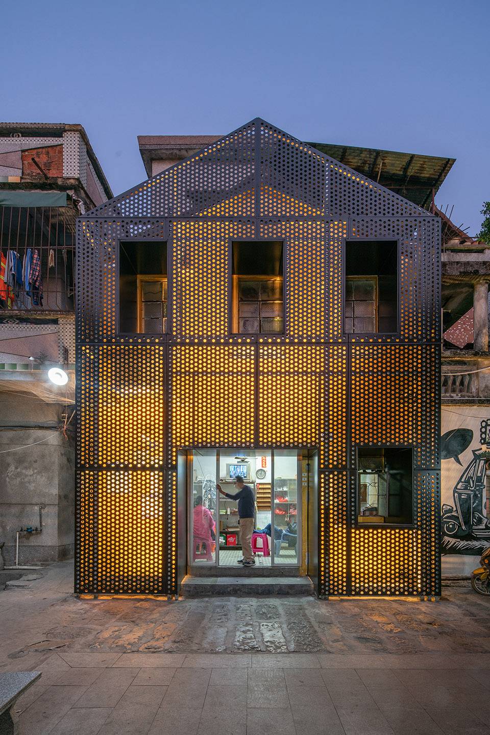 The hexagonal pavilion square near the Longjin River waterlock is one of the core areas of this project. There are many historical sites here, including the Hexagonal Pavilion, the ancient arch, the ruins of the official salt yamen of the Southern Song Dynasty, the ancient wells of Weitou, and the Guanyin Temple. It is also a place for local villagers for relaxing and gathering. The architects chose an old house (mahjong parlor on the first floor and residence on the second floor) directly opposite to the Hexagon Pavilion to redesign the gable wall to create a new dramatic place. The gable wall is made of black perforated aluminum panels (40mm diameter holes), which are detached from the original fa?ade of the old house.