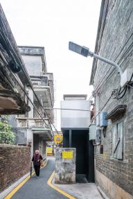 龍津河水閘處的六角亭廣場,是整個沙井古墟新生計劃的核心區(qū)域之一,匯集了眾多歷史古跡,包括六角亭、古牌坊、歸德鹽場衙署遺址、圍頭古井、觀音廟等等,這兒也是當(dāng)?shù)卮迕裥蓍e、聚集的場所。建筑師選擇了六角亭正對面的一棟老屋(一樓是麻將館,二樓為居?。┥綁α⒚孢M(jìn)行改造,試圖在已經(jīng)非常豐富的歷史場景中,塑造出新的戲劇化場所特質(zhì)。山墻立面使用黑色穿孔鋁板(孔徑40毫米),脫離老屋原有山墻建造。