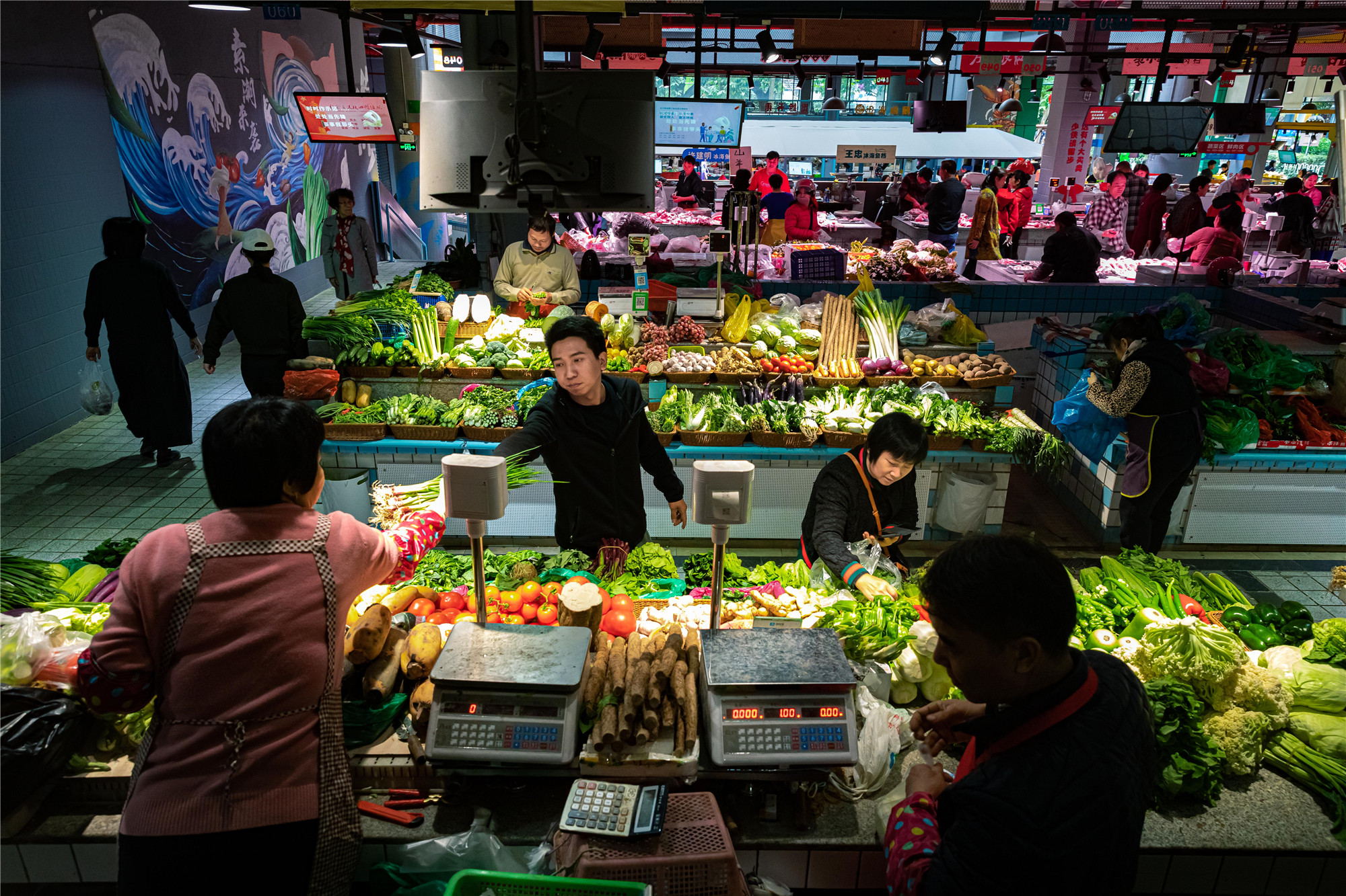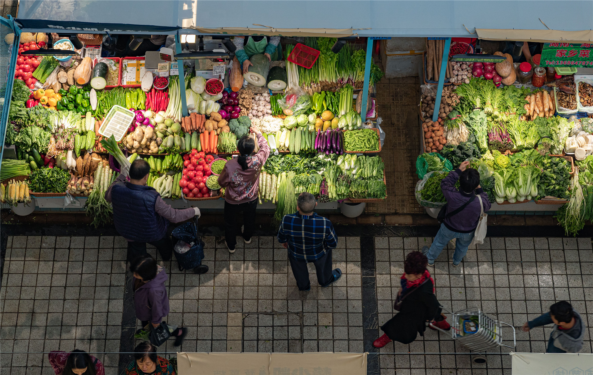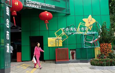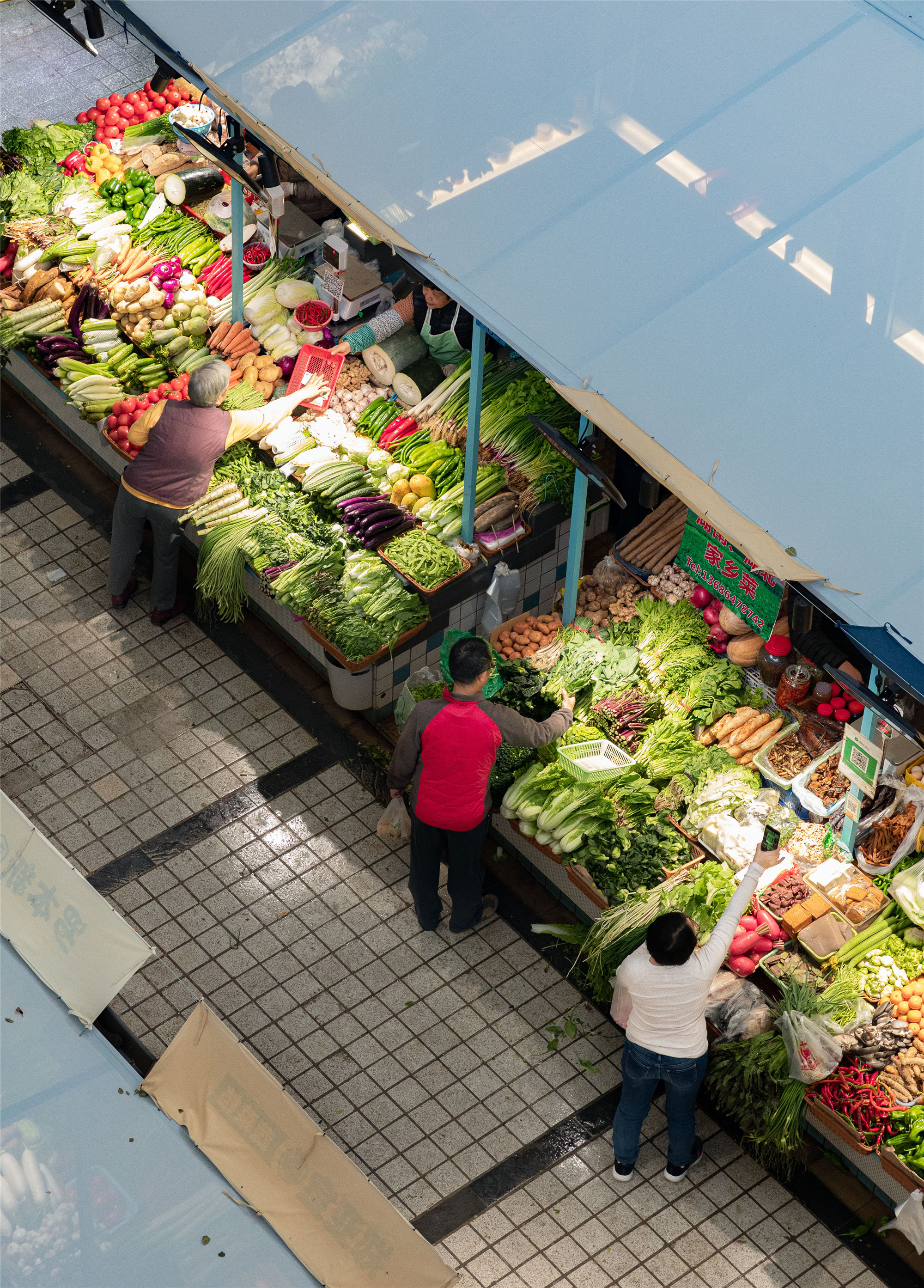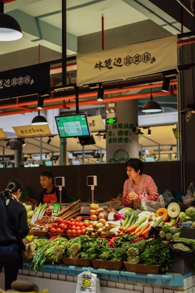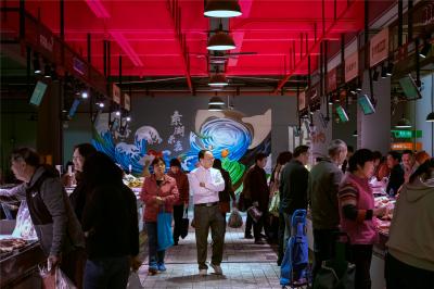 “水產(chǎn)是藍色的,鮮肉是紅色的,副食品是亮黃色的,我們的蔬菜是綠色的?!睌傊鳁顜煾狄谎劭闯隽诉@些色彩的奧秘,他所在的蔬菜區(qū)吸引著越來越多的年輕人,在整潔的環(huán)境中,生活也變得更加悠閑。