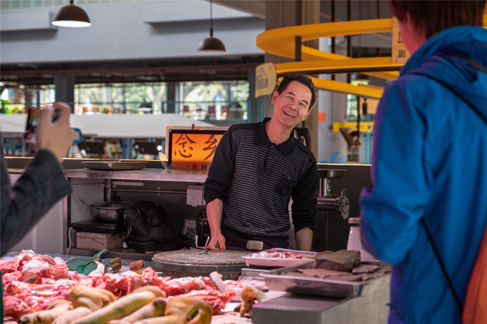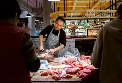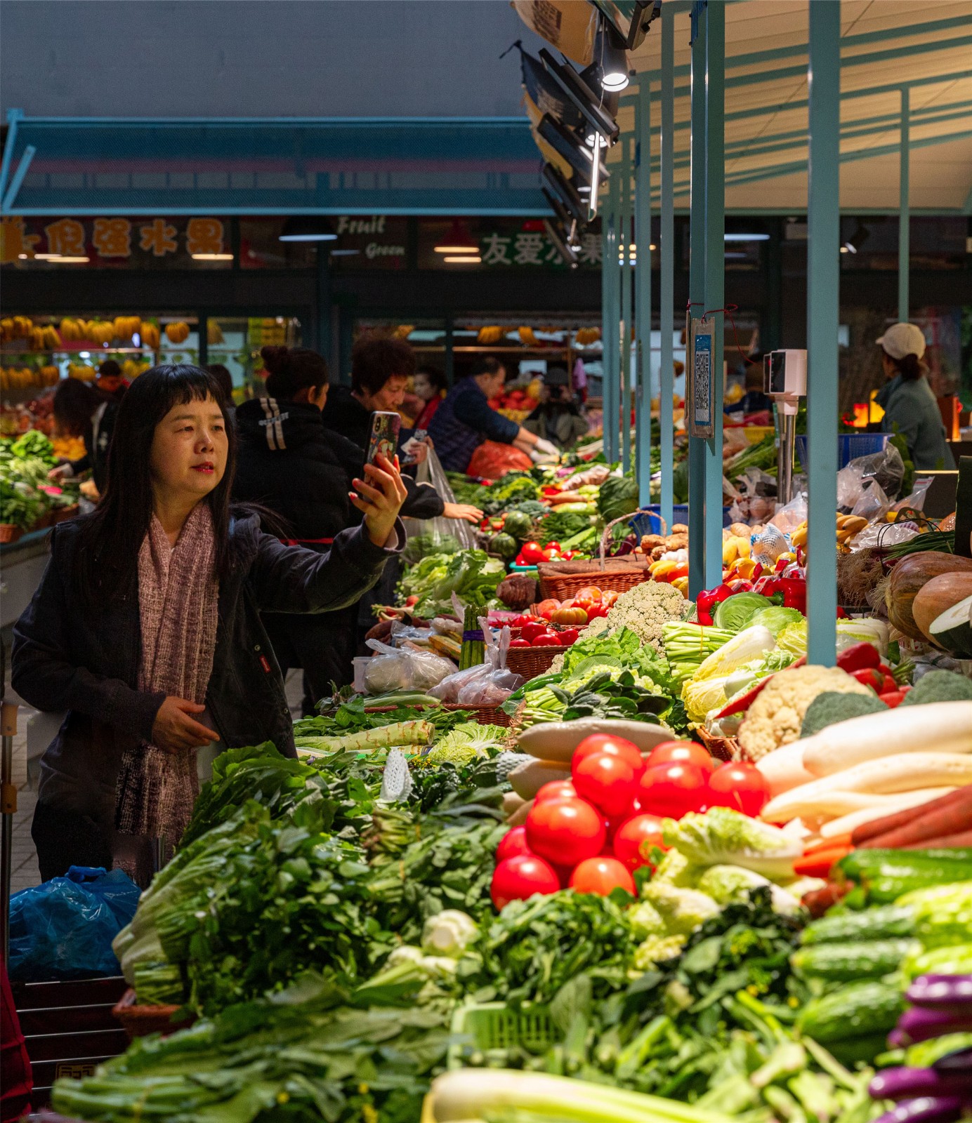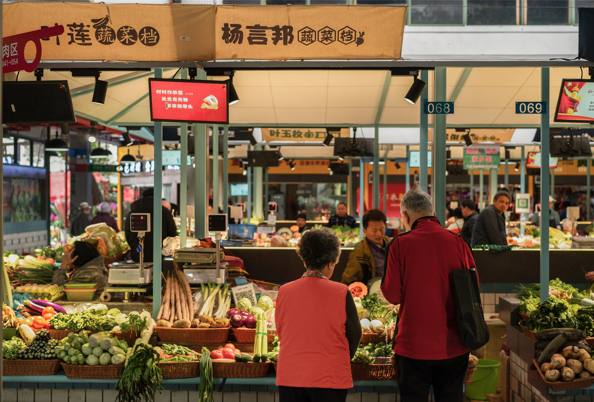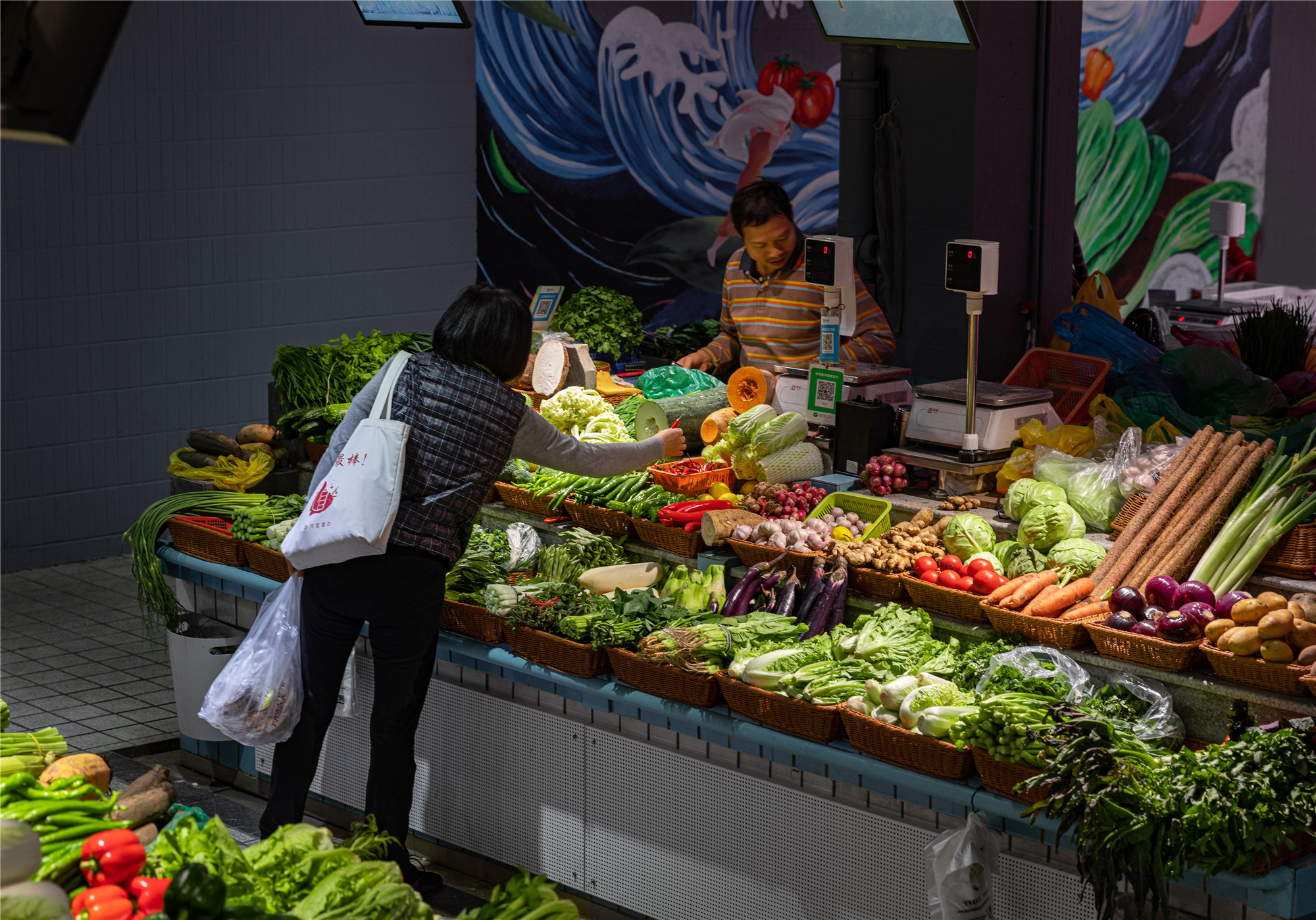 “水產(chǎn)是藍色的,鮮肉是紅色的,副食品是亮黃色的,我們的蔬菜是綠色的?!睌傊鳁顜煾狄谎劭闯隽诉@些色彩的奧秘,他所在的蔬菜區(qū)吸引著越來越多的年輕人,在整潔的環(huán)境中,生活也變得更加悠閑。