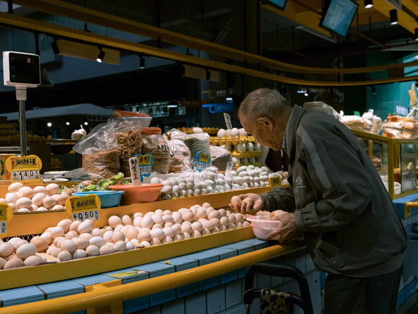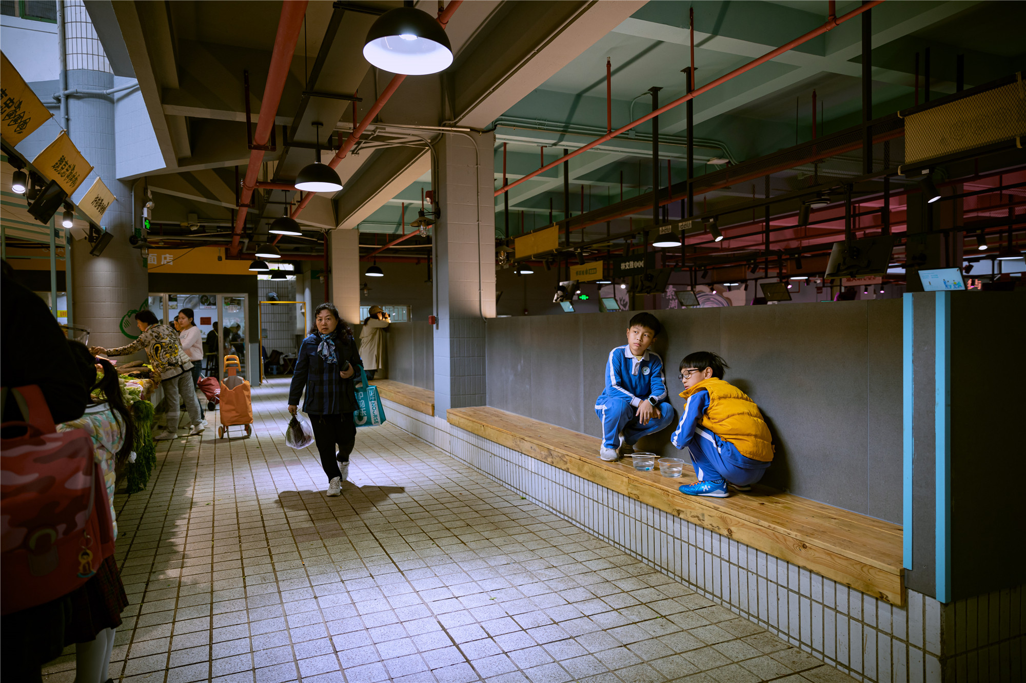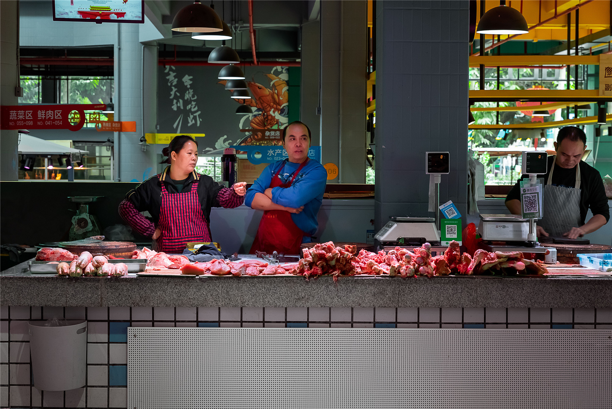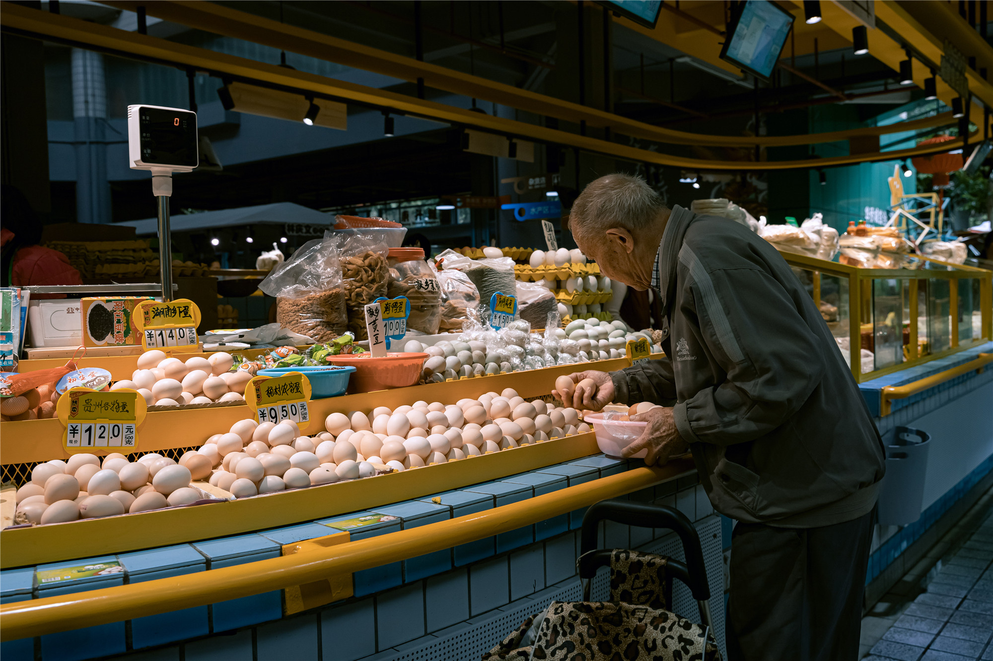 “水產(chǎn)是藍色的,鮮肉是紅色的,副食品是亮黃色的,我們的蔬菜是綠色的?!睌傊鳁顜煾狄谎劭闯隽诉@些色彩的奧秘,他所在的蔬菜區(qū)吸引著越來越多的年輕人,在整潔的環(huán)境中,生活也變得更加悠閑。