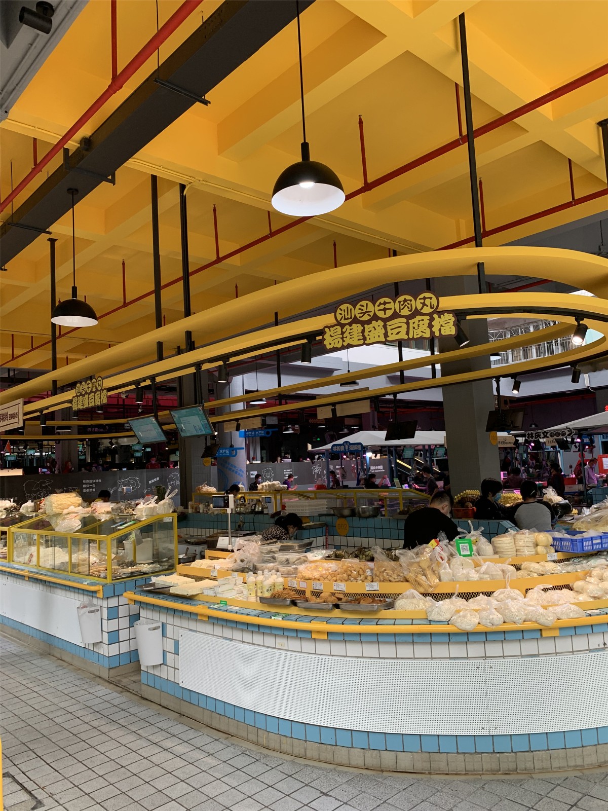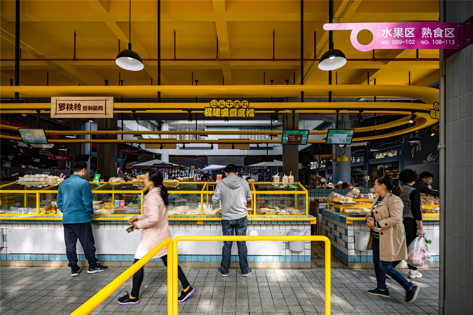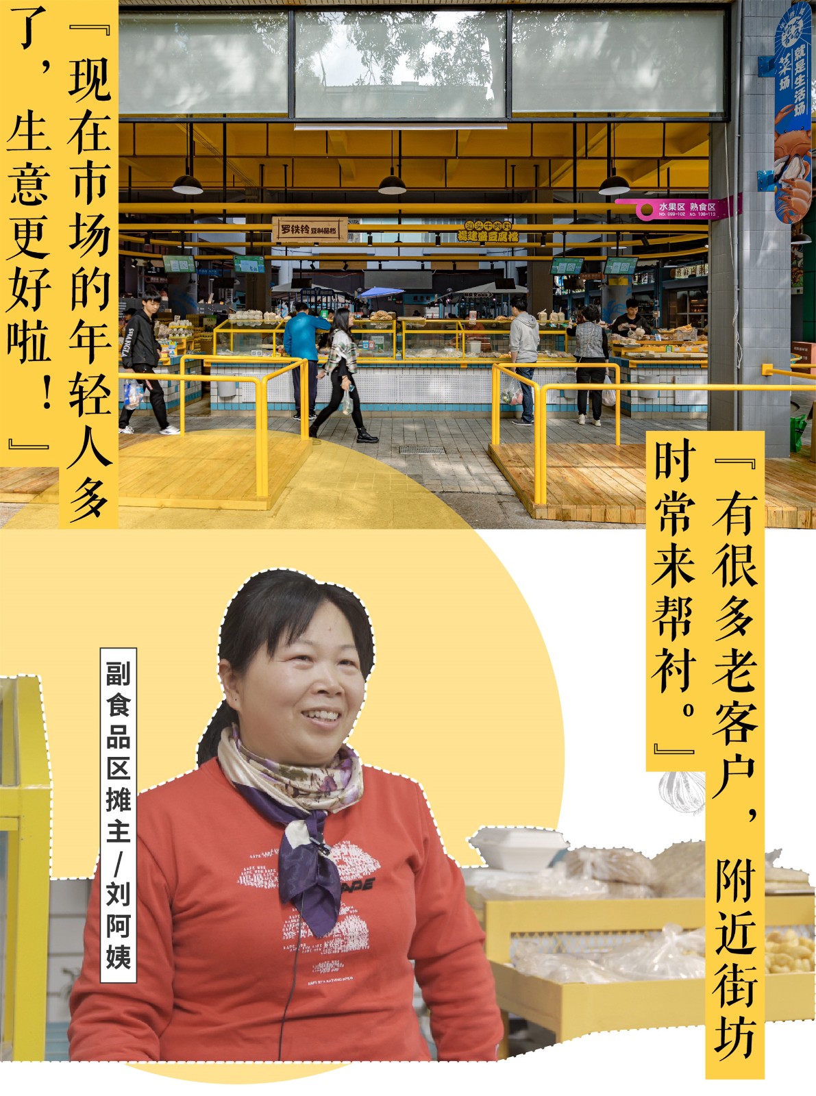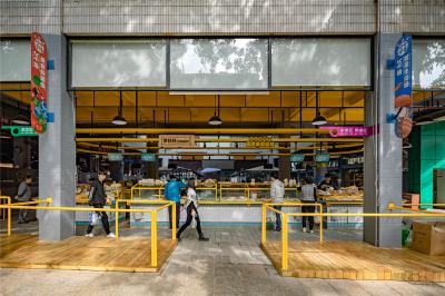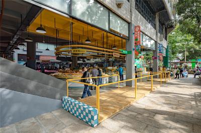 此區(qū)域位于市場入口處,改造前的攤位設(shè)施老舊,缺少吸引力。設(shè)計采用亮黃作為主題色彩,更吸引年輕人。與此同時,針對每個攤位進行相應的改造。