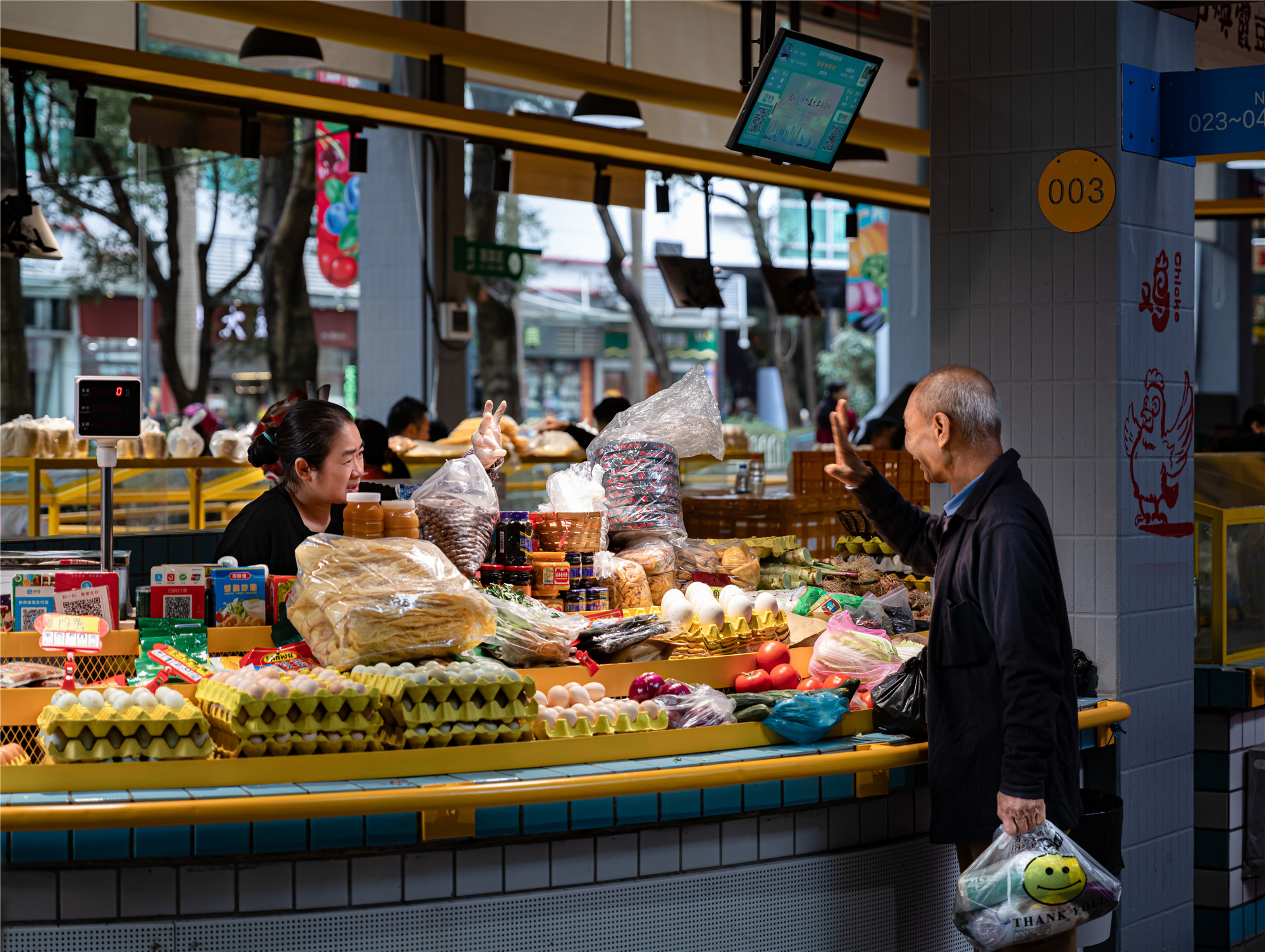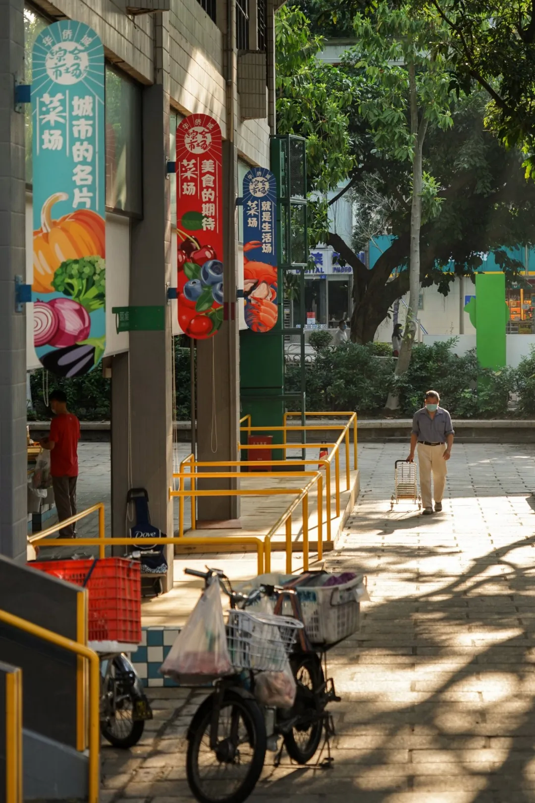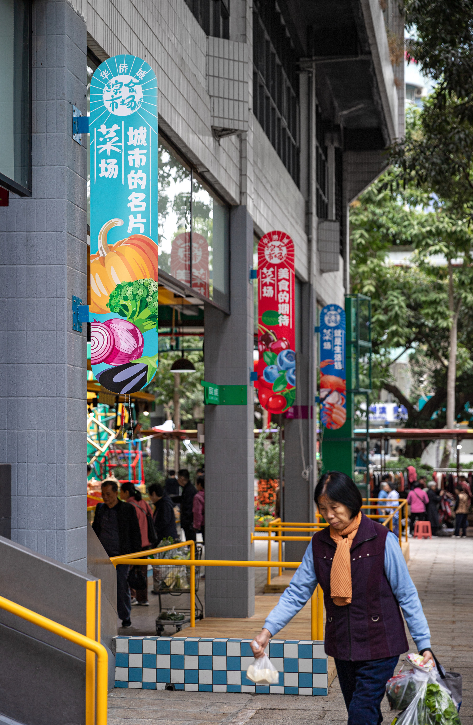 經(jīng)過完整的改造,華僑城附近的居民有了新的打卡地點,“華僑城綜合市場見”。于是,這個位于“世界之窗”附近的菜市場,逐漸成為年輕人日常購物的去處。市場入口處,亮黃色的主題顏色呼應著華僑城片區(qū)的文化氣質(zhì),攤主們在白話和普通話之間自由切換,迎接著來自城市各方的食客。