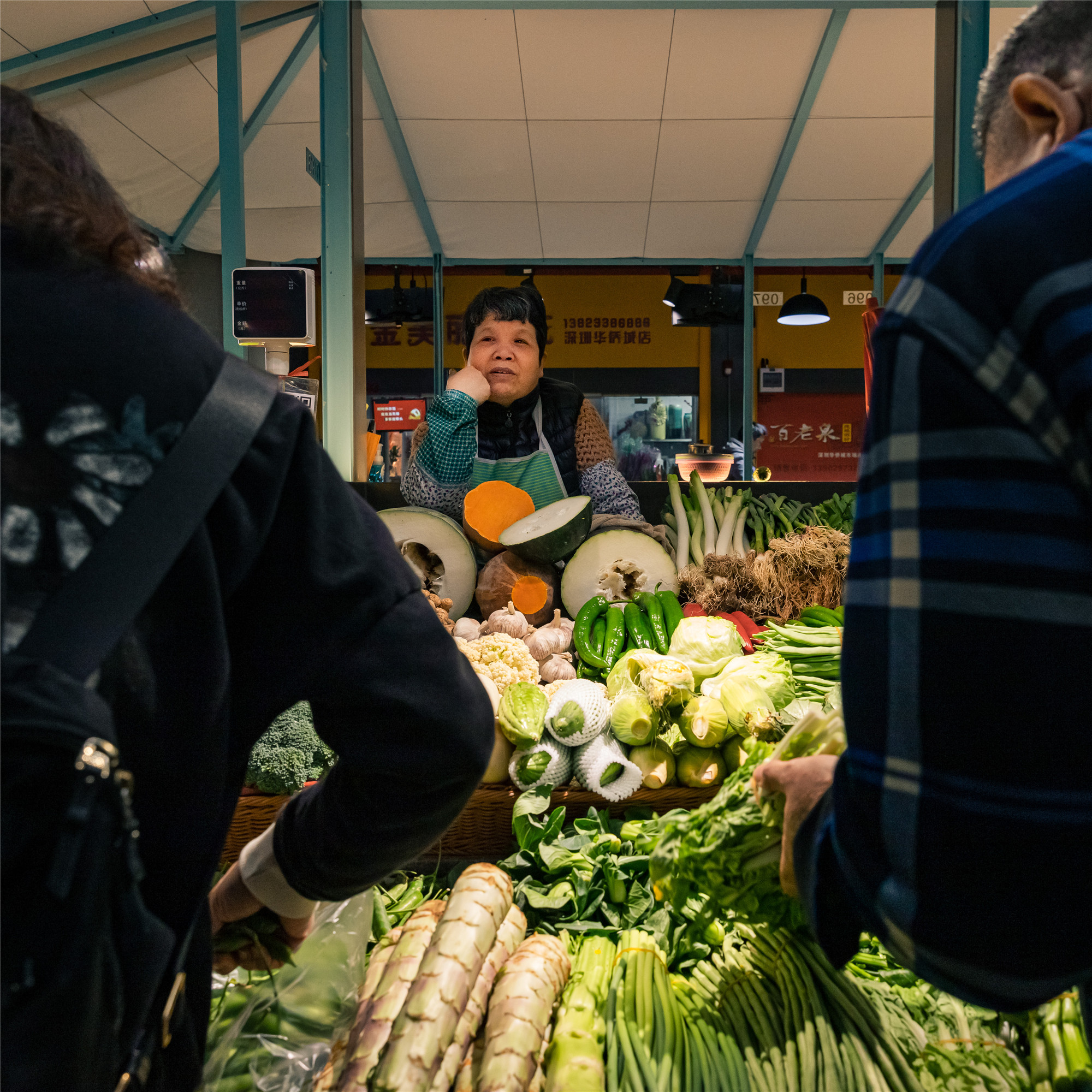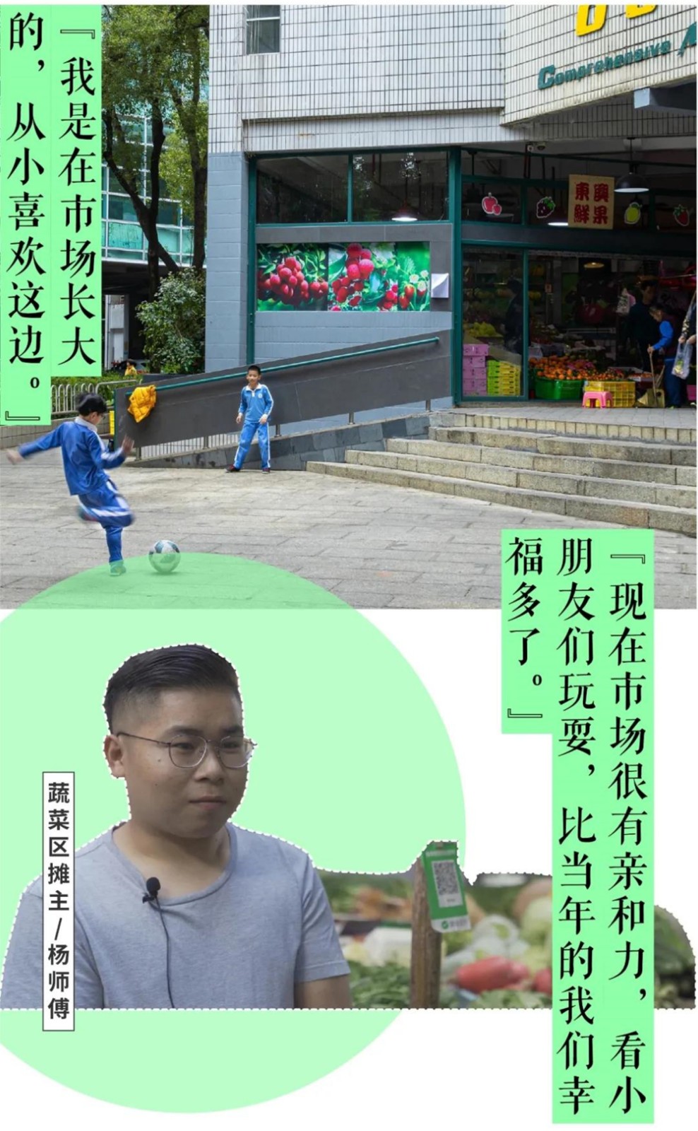 二十多年前,華僑城綜合市場周圍還有大片的工地,小楊時常和小伙伴們在附近玩耍。如今,他子承父業(yè),這個三平米的攤位,成為他一輩子打交道最多的空間。與過往不同的是,他接上流行的互聯(lián)網(wǎng)買菜平臺,并在這個嶄新的檔口,看人來人往,見證城市日新月異,暢想著新的未來?!艾F(xiàn)在小朋友們在整潔的市場里玩耍,比我們當年幸福多了?!彼唤锌?。