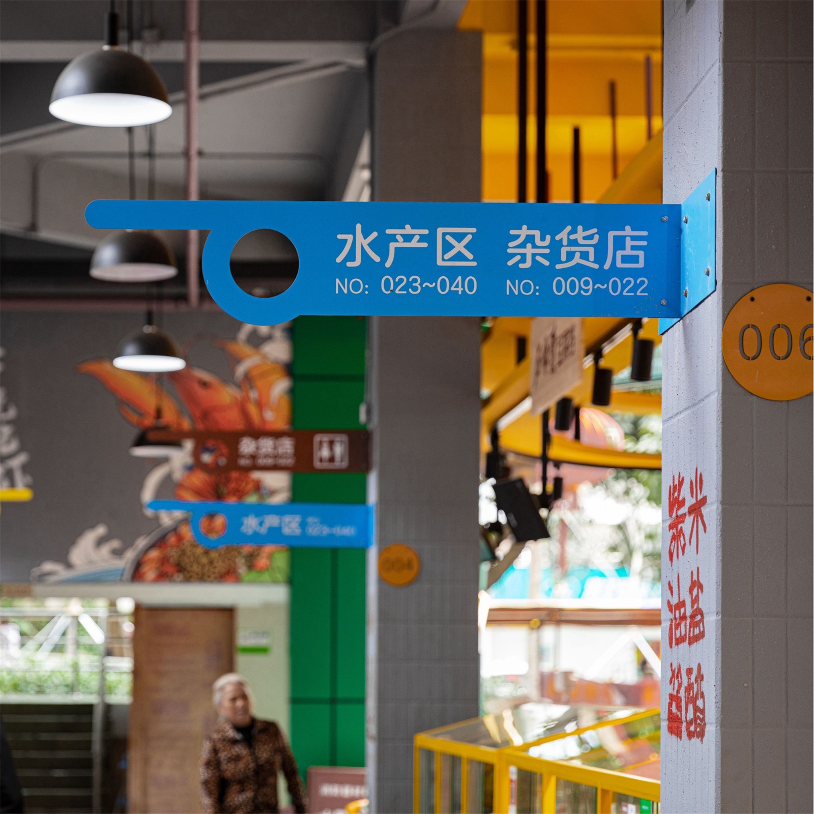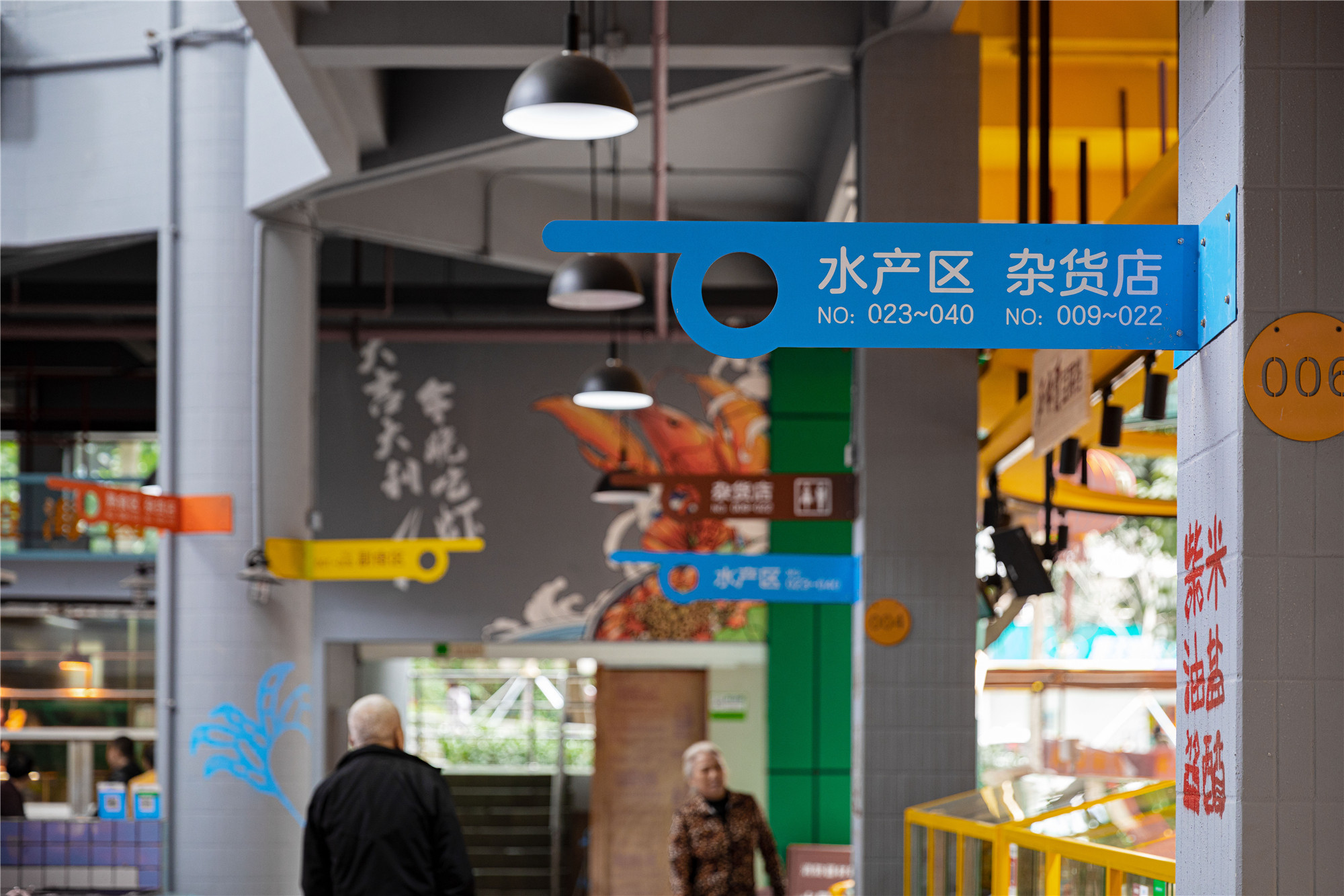 為了更加鮮明地體現(xiàn)不同的功能分區(qū),設(shè)計利用紅、黃、藍、綠等四種色彩,對應不同的食物分區(qū),這種方案既解決了成本,也增加了辨識度。在此基礎(chǔ)之上,為菜市場的人群定制了清晰可辨的鋪裝導視系統(tǒng),快速引導顧客和游客,促進不同區(qū)域之間的交流聯(lián)系。