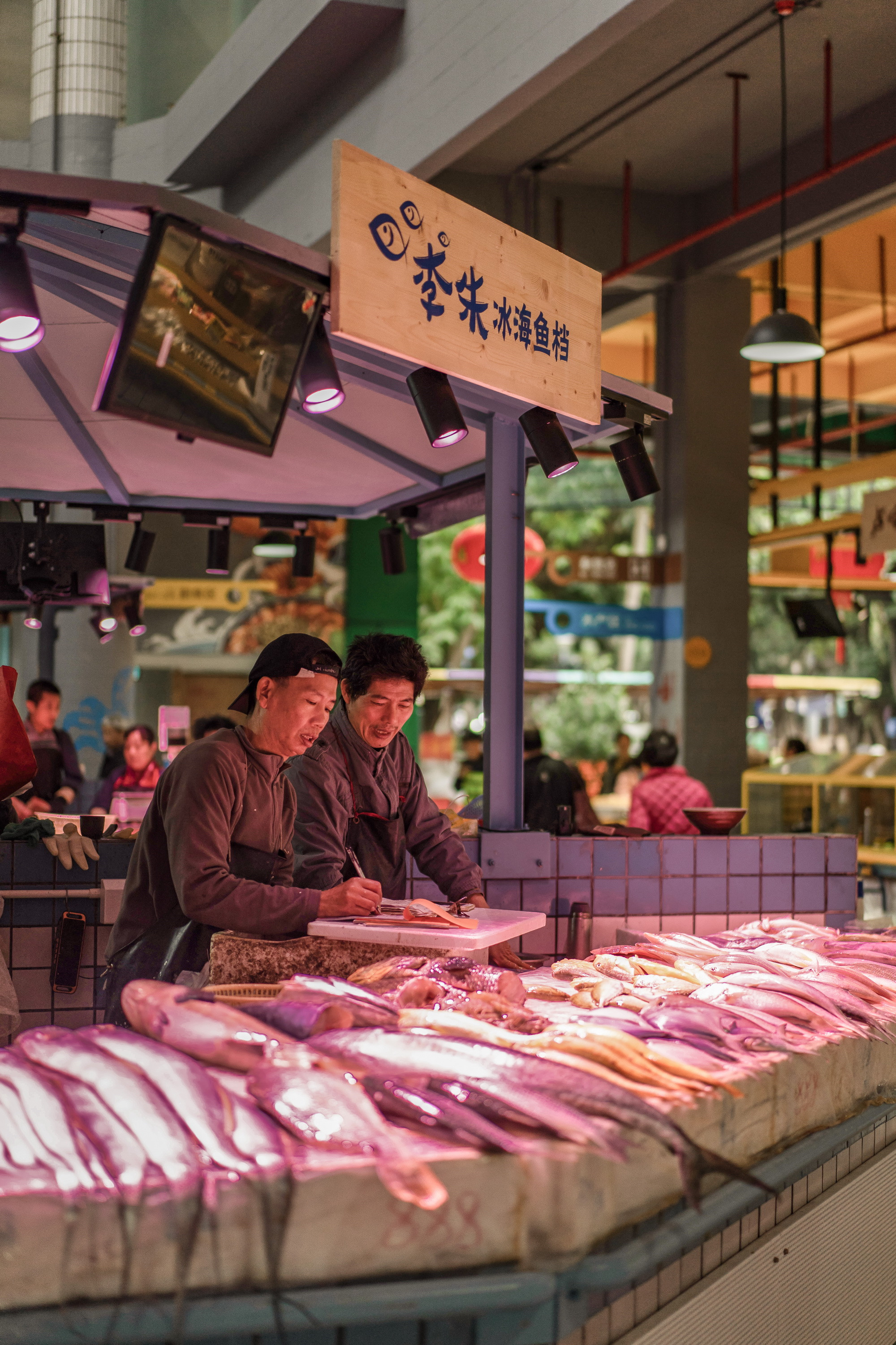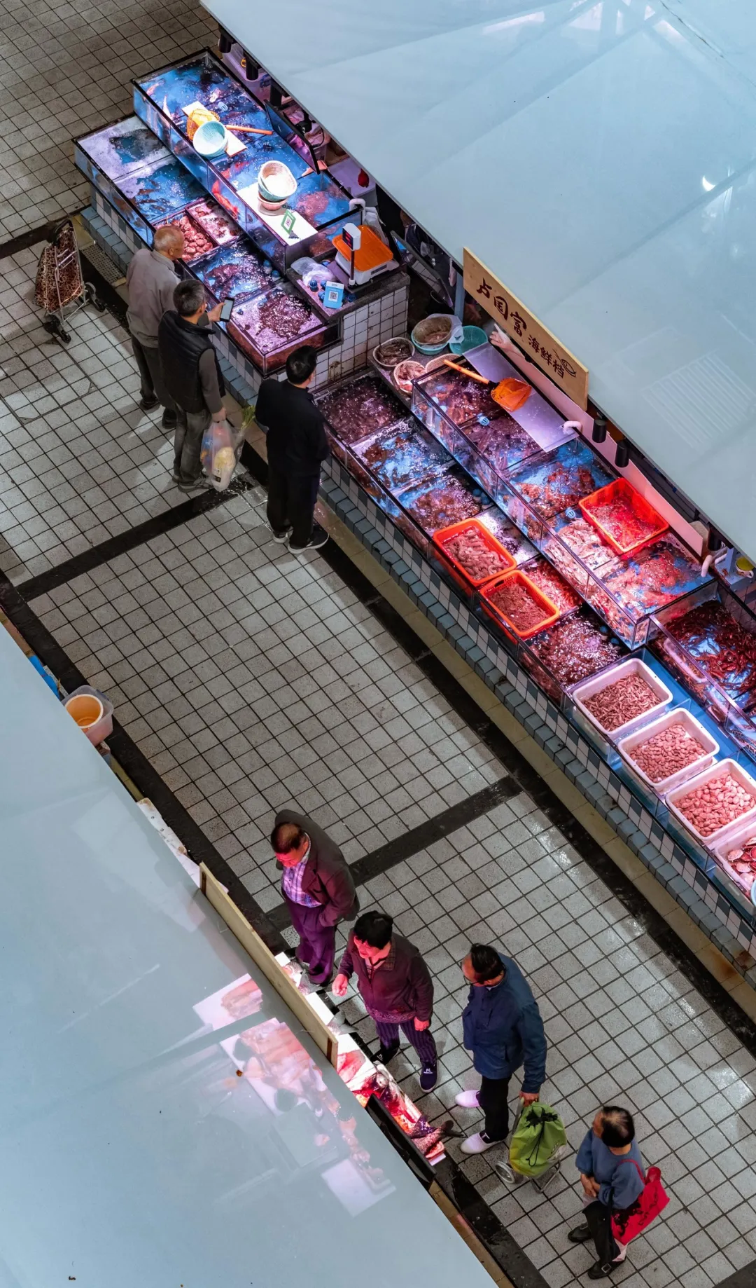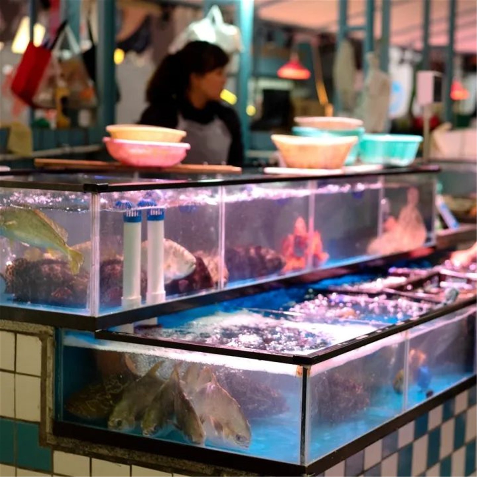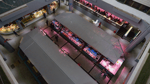 改造策略:翻新水產(chǎn)區(qū)臺面,并量身定制魚缸,使用專業(yè)4000K生鮮燈照射,營造嶄新的市場氛圍