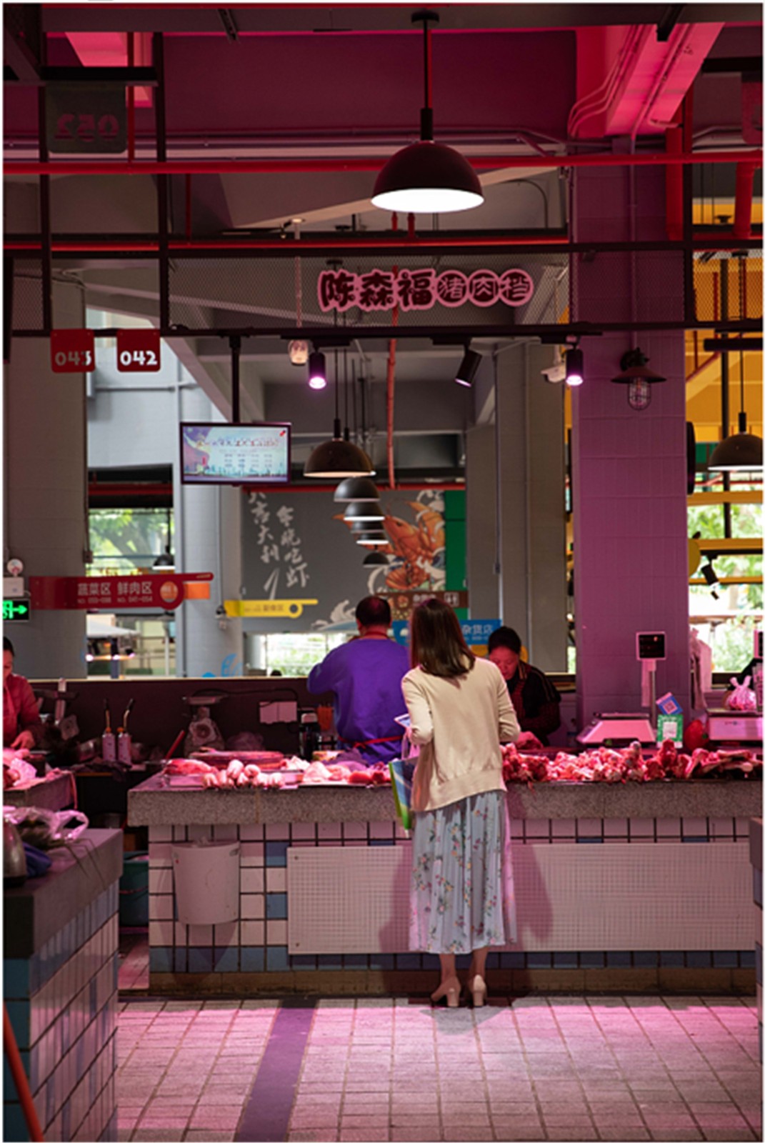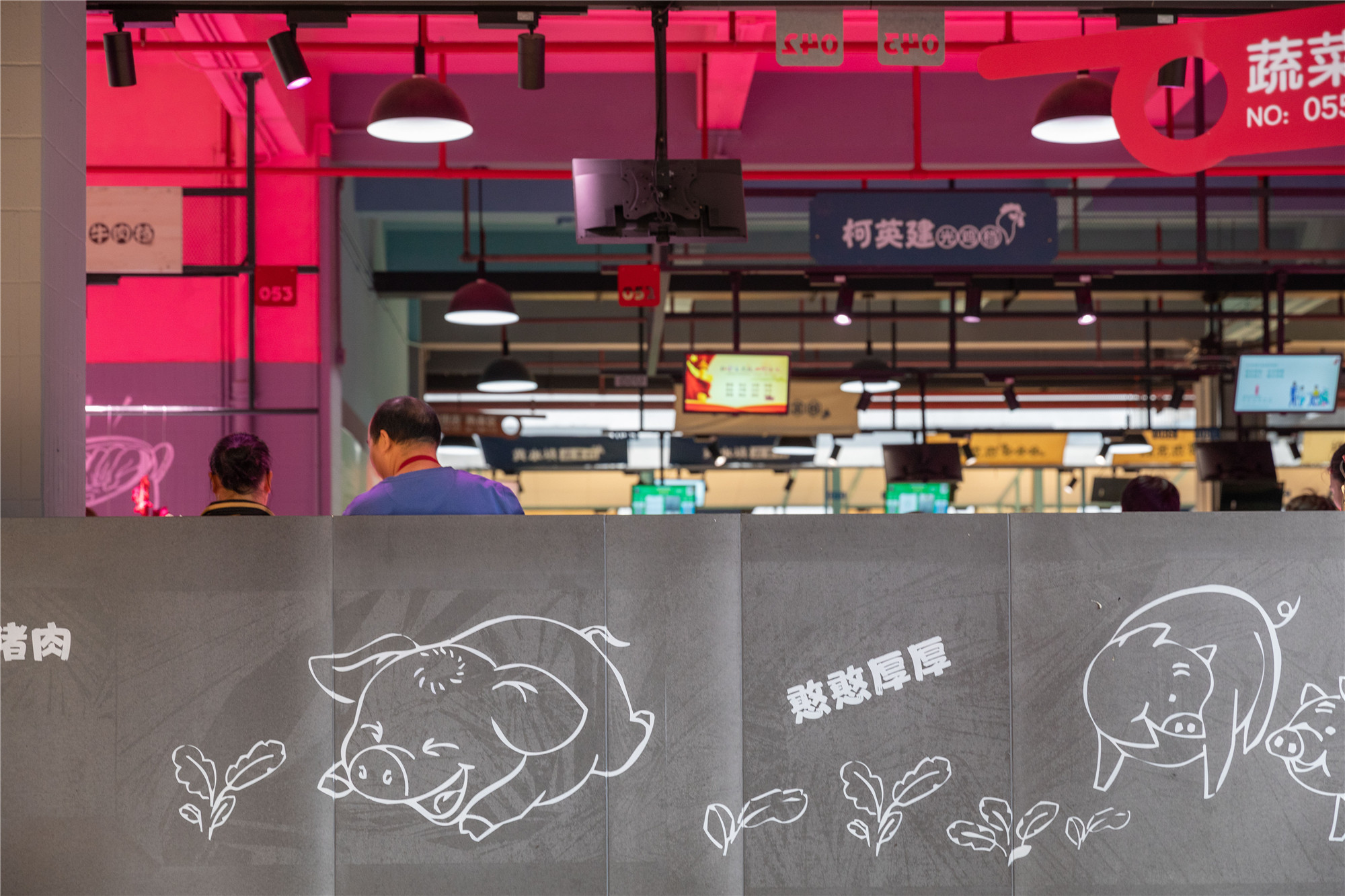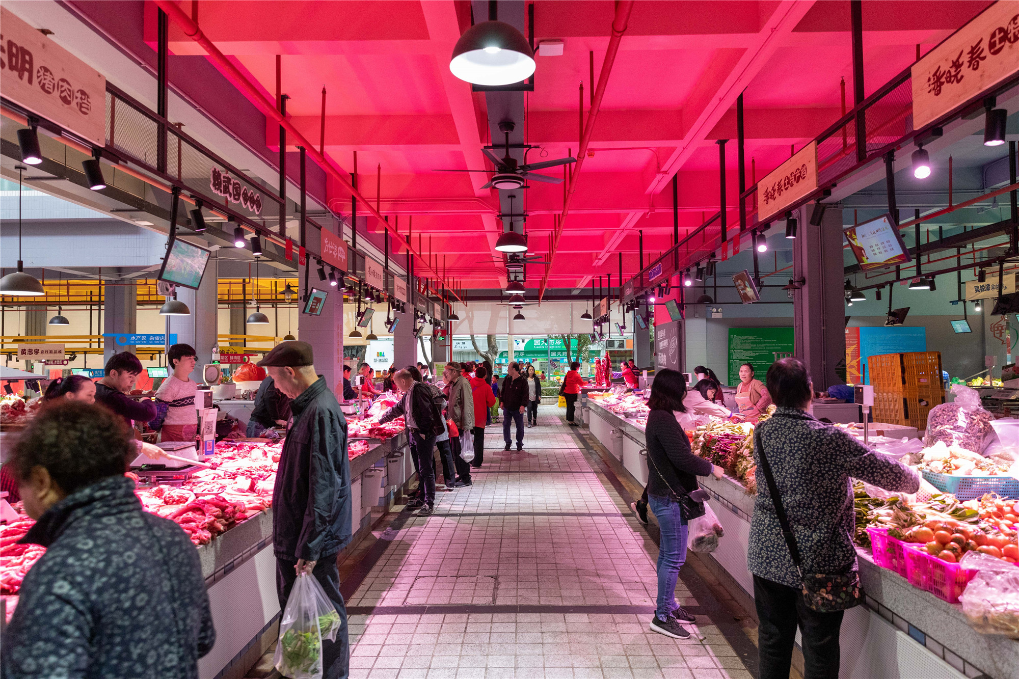 鮮肉區(qū)設(shè)施老舊,部分砧板晃動,影響商戶的使用體驗。設(shè)計采用紅色作為分區(qū)主題色,并通過創(chuàng)意墻繪增加品牌屬性。市場內(nèi)的光線主要依靠自然采光和燈光補給,光源不均衡,環(huán)境較為昏暗。根據(jù)不同分區(qū)內(nèi)攤位的需求,設(shè)置相應的攤位燈、日光燈,提供光感均衡明亮的買菜體驗。