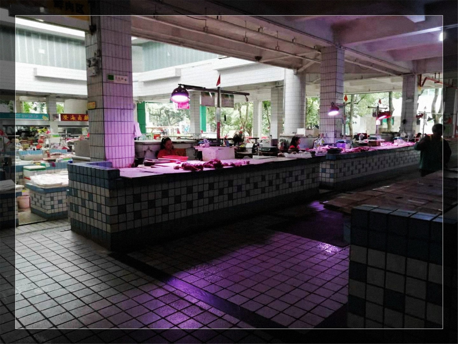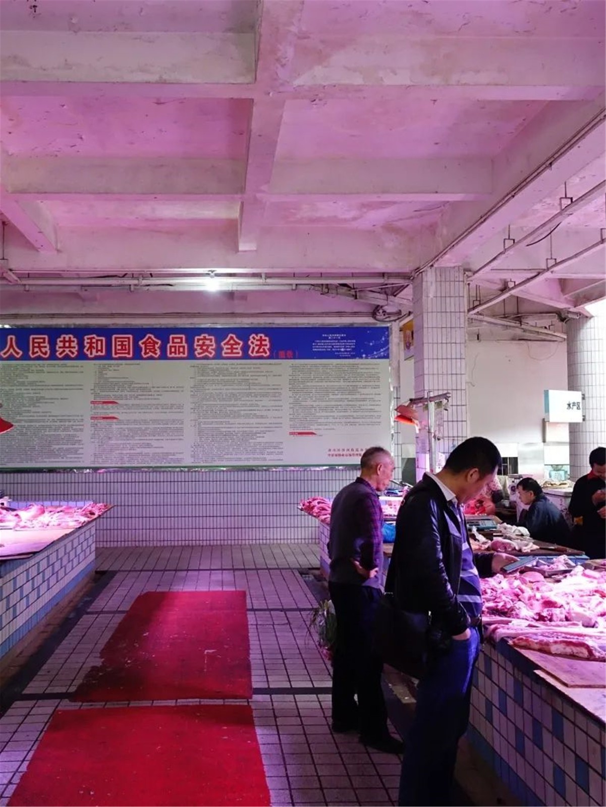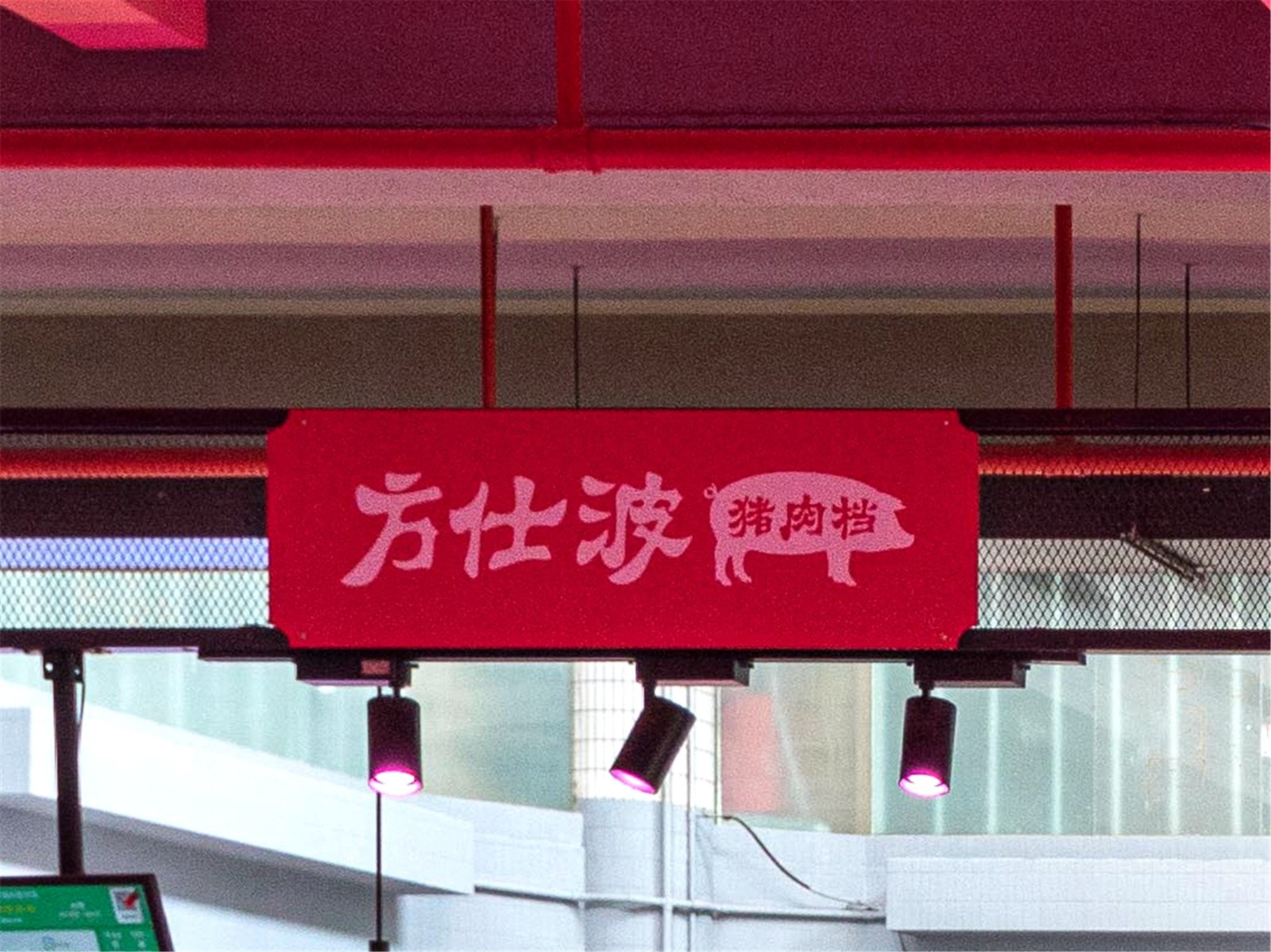 鮮肉區(qū)設(shè)施老舊,部分砧板晃動,影響商戶的使用體驗。設(shè)計采用紅色作為分區(qū)主題色,并通過創(chuàng)意墻繪增加品牌屬性。市場內(nèi)的光線主要依靠自然采光和燈光補給,光源不均衡,環(huán)境較為昏暗。根據(jù)不同分區(qū)內(nèi)攤位的需求,設(shè)置相應的攤位燈、日光燈,提供光感均衡明亮的買菜體驗。