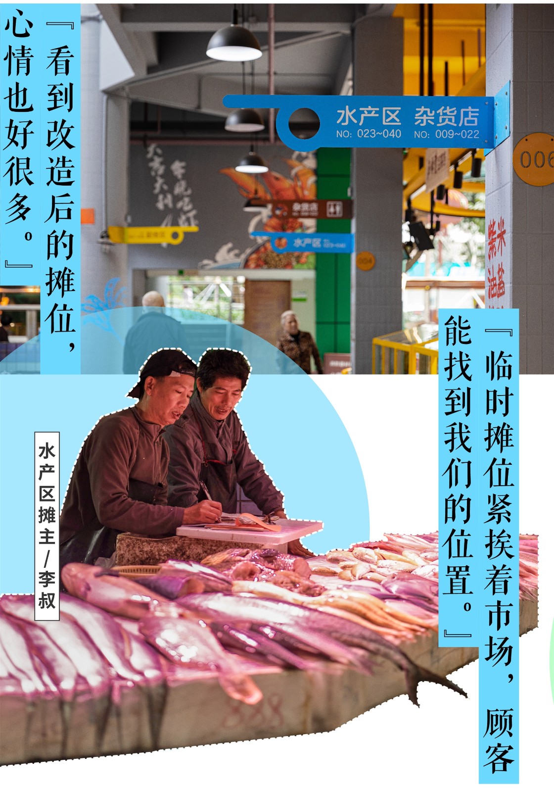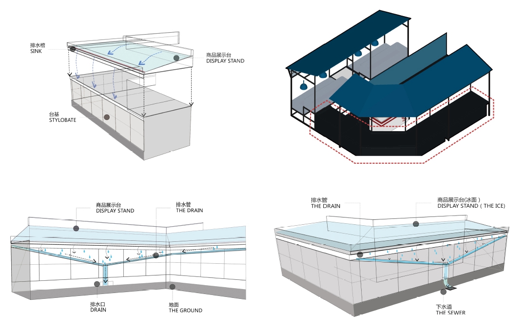 水產(chǎn)區(qū)位于市場的天井區(qū)域,攤位大多使用泡沫箱作為魚缸,商品擺放較為雜亂,容易導致地面濕滑。設(shè)計采用藍色作為主題色,著重改造臺面和排水問題,并增設(shè)帆布頂棚。