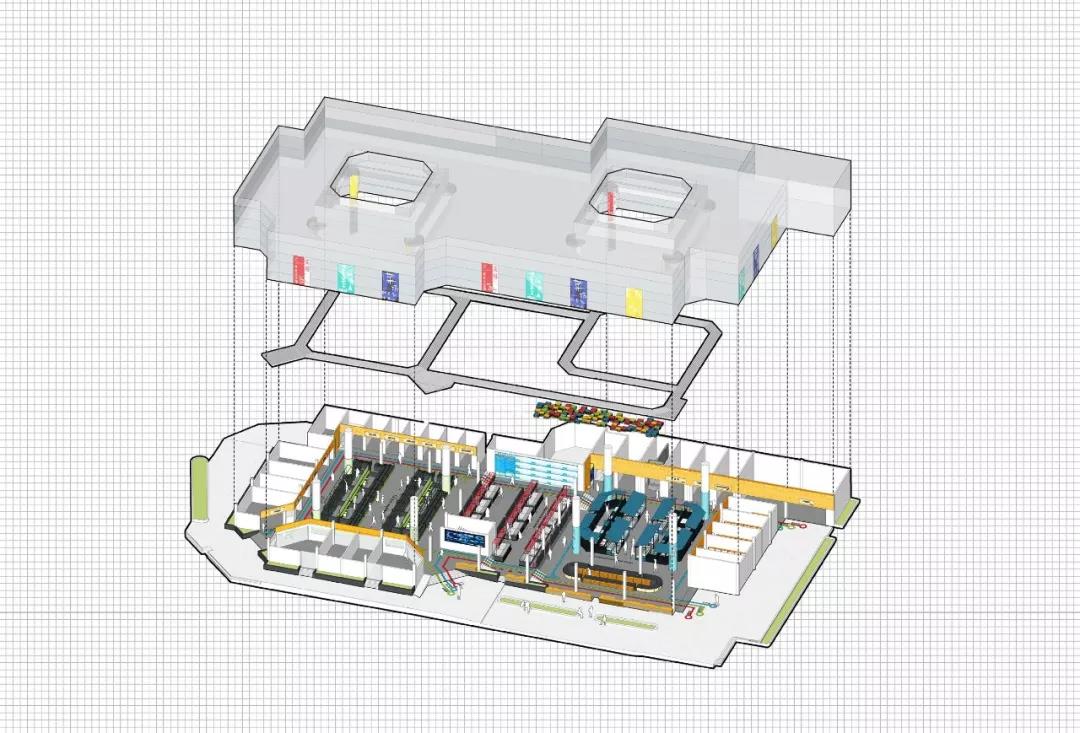 改造策略:頂部設(shè)置亮色分區(qū)、增設(shè)吊頂軌道;攤位定制擺貨架和玻璃擺貨柜、繞中島一圈設(shè)置人性化的扶手