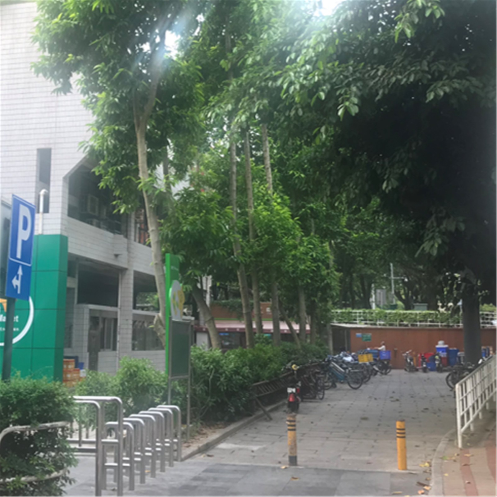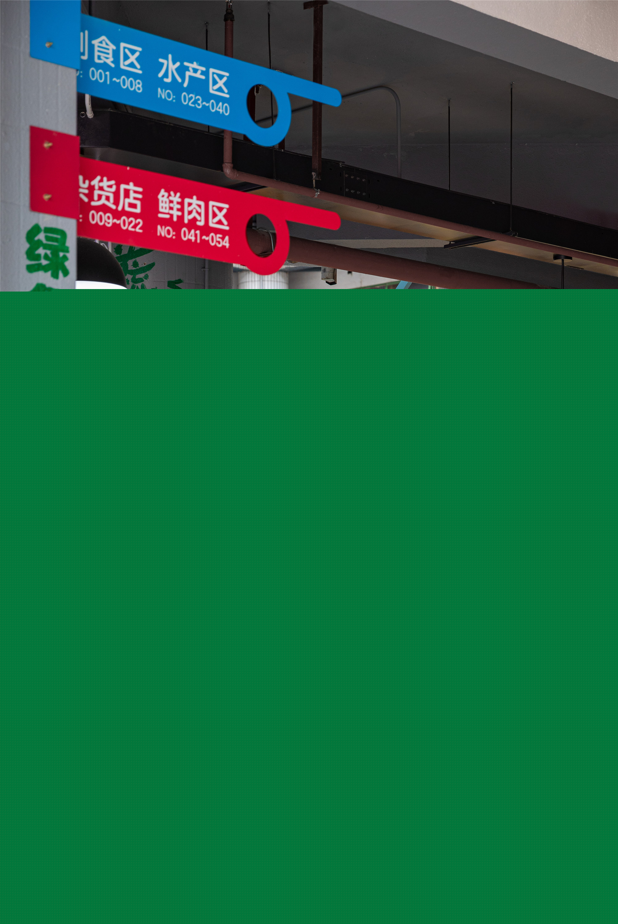 該區(qū)域位于西側(cè)天井區(qū)域,改造前的攤位缺少店鋪招牌,缺乏可識別性,而且塑料籃、泡沫籃擺放雜亂。設(shè)計改造綠色作為主題色,并統(tǒng)一改造店招和臺面。