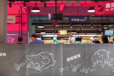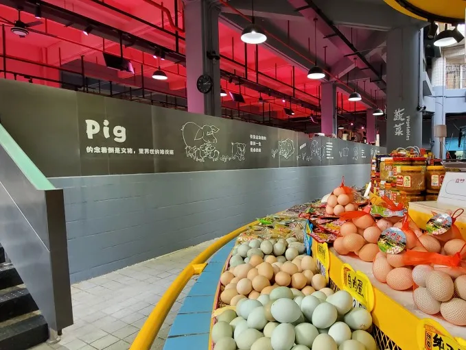 改造策略:西部蔬菜區(qū)處于露天位置,故增加遮陽防水棚,中間增加隱藏式燈帶;采購標準化菜籃,菜品擺放有序