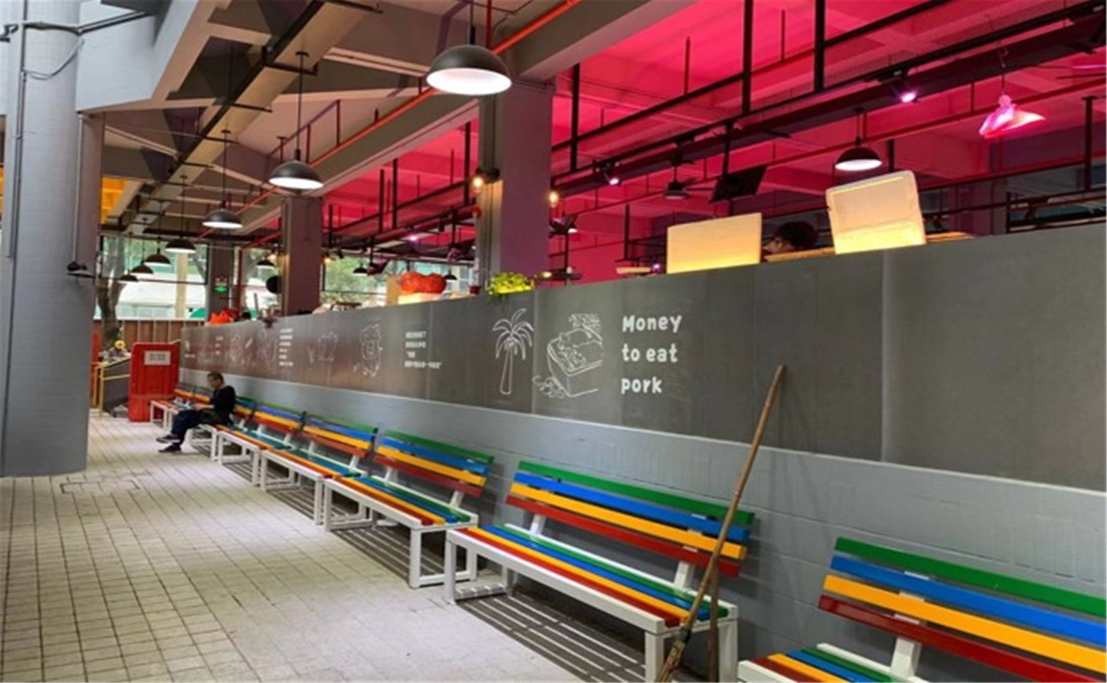 改造策略:墻繪趣味故事“豬的一生”,下方配置長條彩虹椅,供客人休息