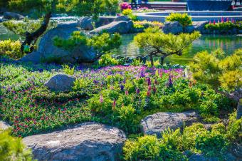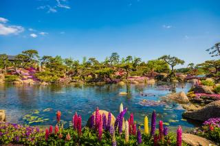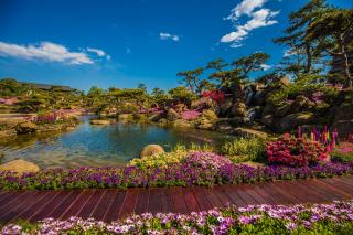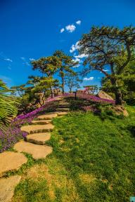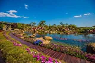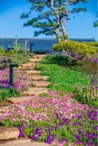 In this landscape, a flight of geese is shown by plant landscape, signifying that auspicious clouds will bring prosperity and beauty to the participating countries. This time, the ground cover plants in the Summer Garden provide a noble but unobtrusive purple as the main tone of the scene. Subsequent variety matching and flower border designs are based on this tone. The design technique of assembling the parts into the whole creates a harmonious and unified effect. When considering that the distant mountains and the platform provide background and the foreground to the tea break area respectively, a distinction is made between the collocation methods of the ground cover plant varieties. In the close view, the flower borders are designed with textured flower varieties, and the tea break garden stands out through abundant plant collocation. In the distant view, the method of flaky planting is used to grow varieties with high color saturation, choosing appropriate positions amongst the purple tones of the mountains to brighten the color, and avoid the monotony and somberness of the distant mountains. Due to the large volume of stones stacked besides the waterfall in the distant mountains, the bonsai of Bougainvillea spectabilis Willd.
