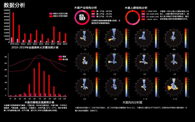 ▲ 數(shù)據(jù)分析(全國森林火災(zāi)受損情況、木里的產(chǎn)業(yè)與人群結(jié)構(gòu)分析、木里溫濕度分析、木里風(fēng)向分析) ? 鄢夢玲 詹芳芷 王婕 張靖怡 宋晨曦
