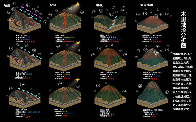 木里是我國森林儲備量最大的縣,屬于亞熱帶季風(fēng)區(qū),冬春兩季干燥少雨,極易發(fā)生火災(zāi)。木里地勢險峻,一旦起火,火勢蔓延極快,主要有樹冠火與地表火兩類,加之交通不便,風(fēng)向不定,容易造成人員傷亡,針對木里火災(zāi)特點,本方案采用了預(yù)防為主的手段。