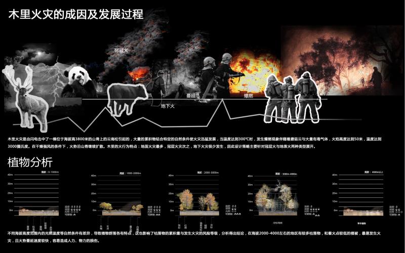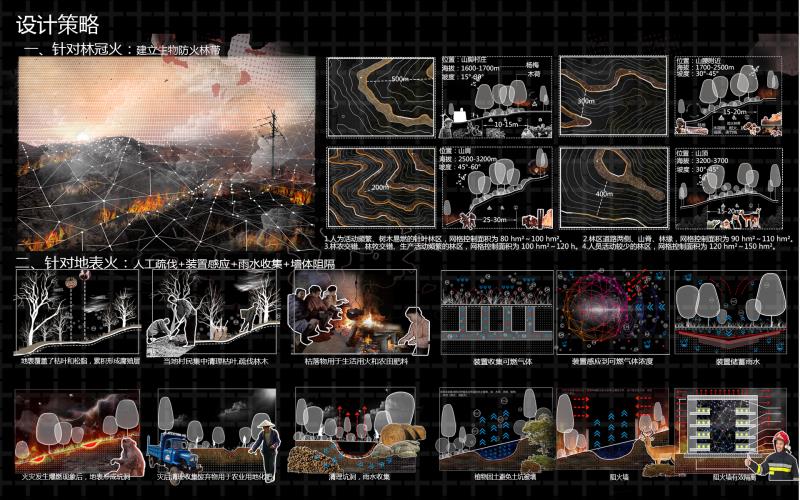 ▲ 設(shè)計策略(分別針對木里多發(fā)生物林冠火與地表火兩種火行為進行設(shè)計) ? 鄢夢玲 詹芳芷 王婕 張靖怡 宋晨曦