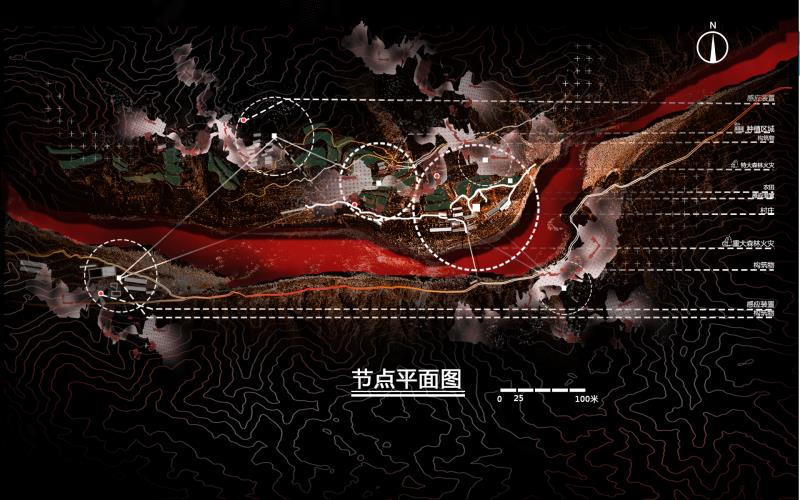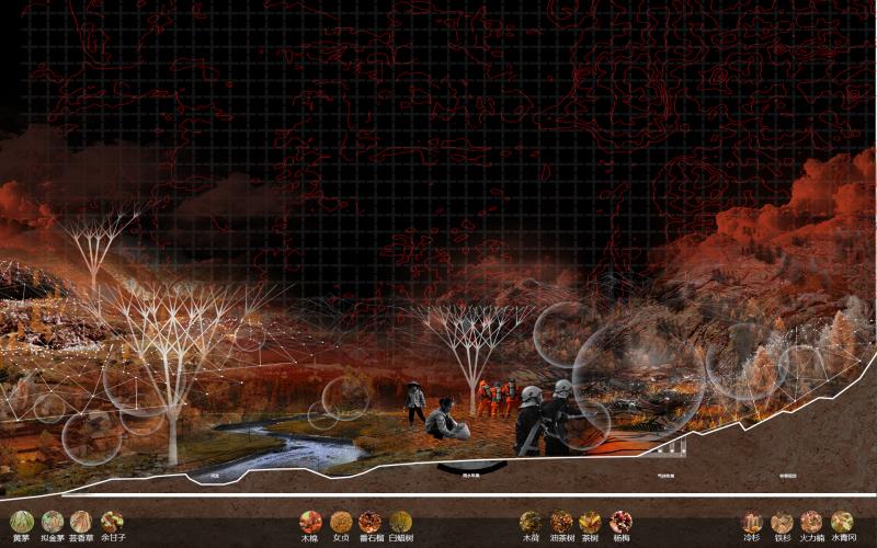 對于樹冠火,設(shè)計生物防火林帶,針對具體的坡度,海拔高度,及植被密度,搭配不同高度的防火植物,形成寬窄不一的林帶。對于地表火,采用人工疏伐清理與產(chǎn)業(yè)結(jié)合、設(shè)備感應(yīng)吸收氣體、雨水收集,設(shè)置阻火墻等手段,多管齊下。設(shè)計了兩個裝置“希望之樹”和“森林之光”,代表了設(shè)計的初衷與美好展望,希望木里森林可以收獲希望,再無犧牲,而后輩們防患于未然,提前做好預(yù)防工作,再無火災(zāi)和傷痛,讓犧牲的英烈們安息。