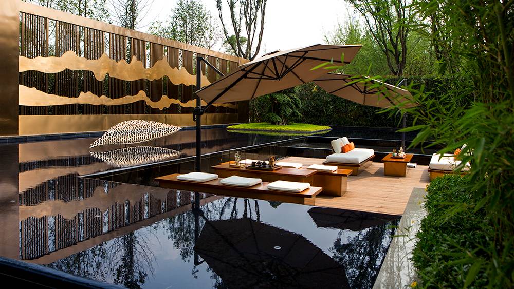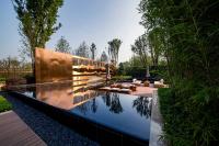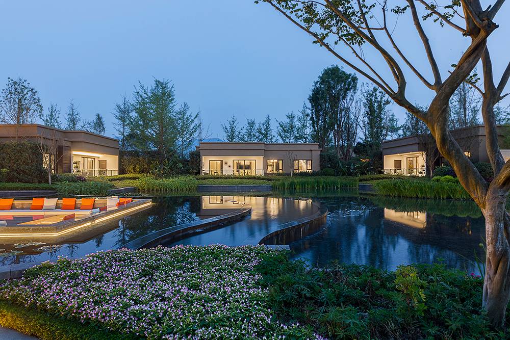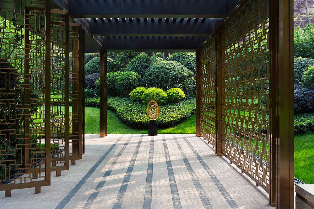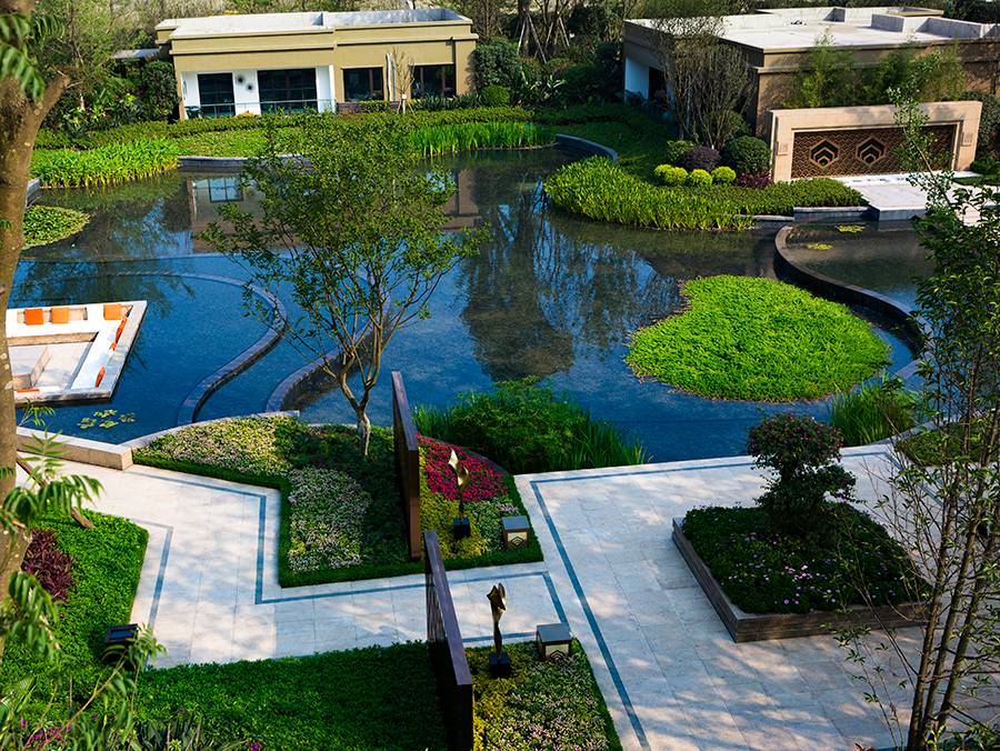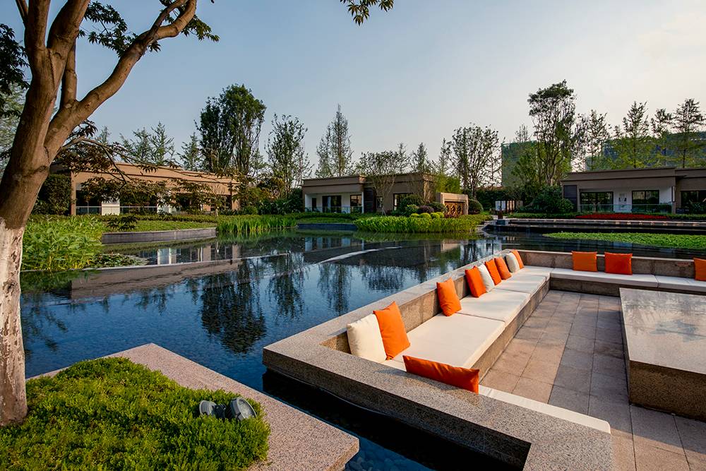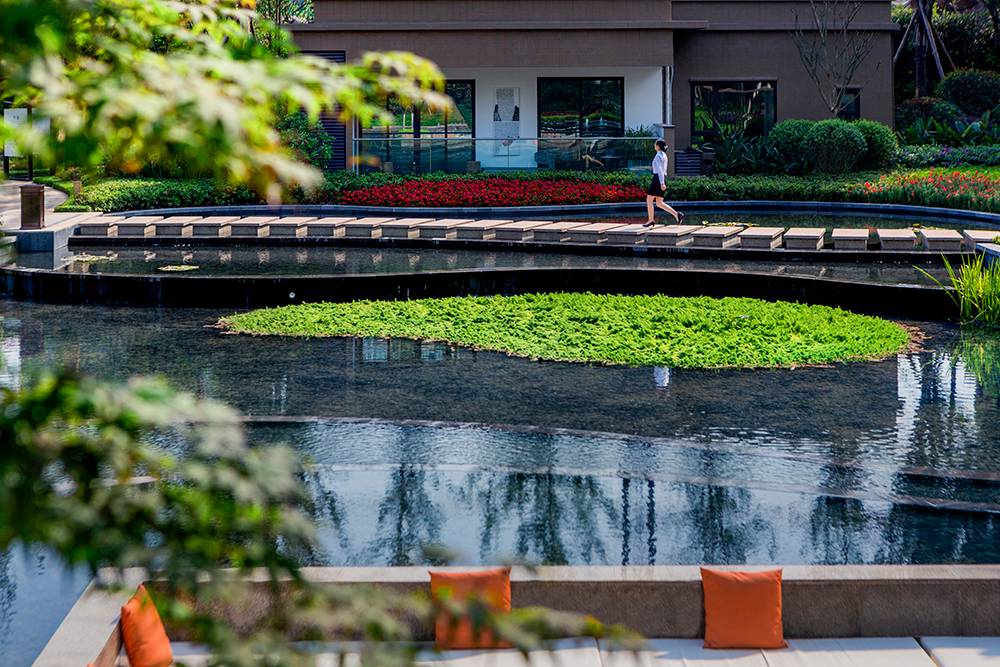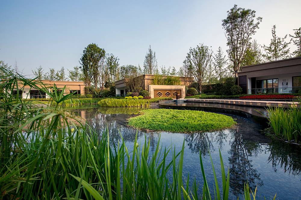 一進(jìn)入園,高山流水輝映成時空交錯中的一幅典雅畫卷。移步其中,二進(jìn)穿庭,徜徉在清幽植株間,覓一處難得的清凈地界,體驗匠心獨運的巧妙。覽景而至,三進(jìn)登堂,一壺清茶暈起一抹青煙,飄逸在如鏡面一般的水景之中,綠波中映著來客盈門,郁郁蔥蔥中閃著波光粼粼,微風(fēng)輕曳中宛入清境。