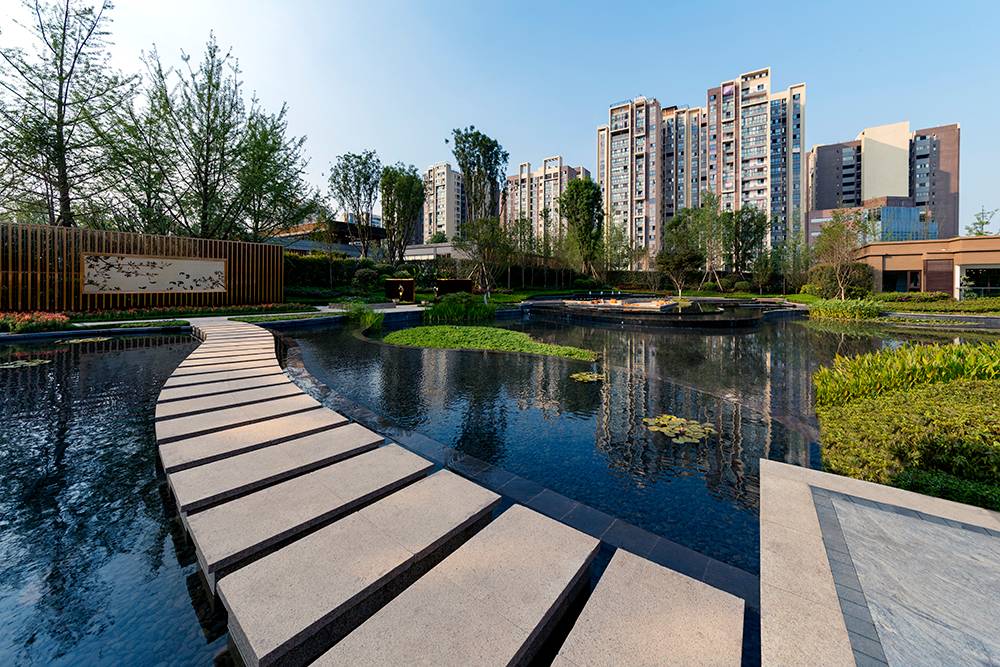 作為區(qū)域代表性園林宅邸,景觀設(shè)計將現(xiàn)代都市水景手法——鏡面水景首次引入宜賓,一步一景中,將物境、情景、意境融為一體,以中國傳統(tǒng)山水畫為設(shè)計來源,提升山水元素運用,設(shè)置琴絲園、曲水園、山水庭、玲瓏閣等景觀節(jié)點,營造寧靜純粹的水景倒映天景,將身心釋放于水天一色。
